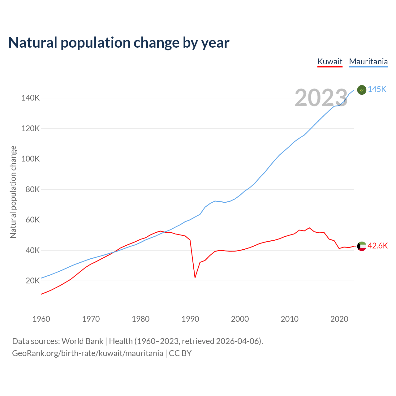 Kuwait has an annual birth rate of 10.3 births per 1,000 people, compared to 34.4 for Mauritania. The average number of children a woman is expected to have during her lifetime — the fertility rate, is 1.52 in Kuwait and 4.7 in Mauritania — 208.2% difference.