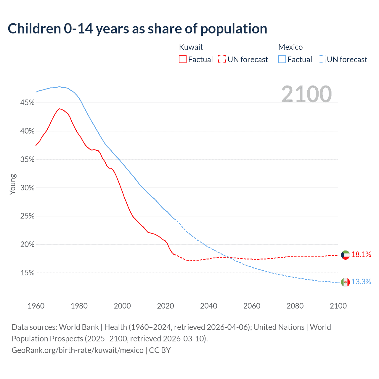 According to the latest available data on birth rates, the fertility rate in Kuwait was 1.52 children per woman in 2023, compared to 1.91 in Mexico in 2023. The replacement level is considered to be 2.1 children per woman.