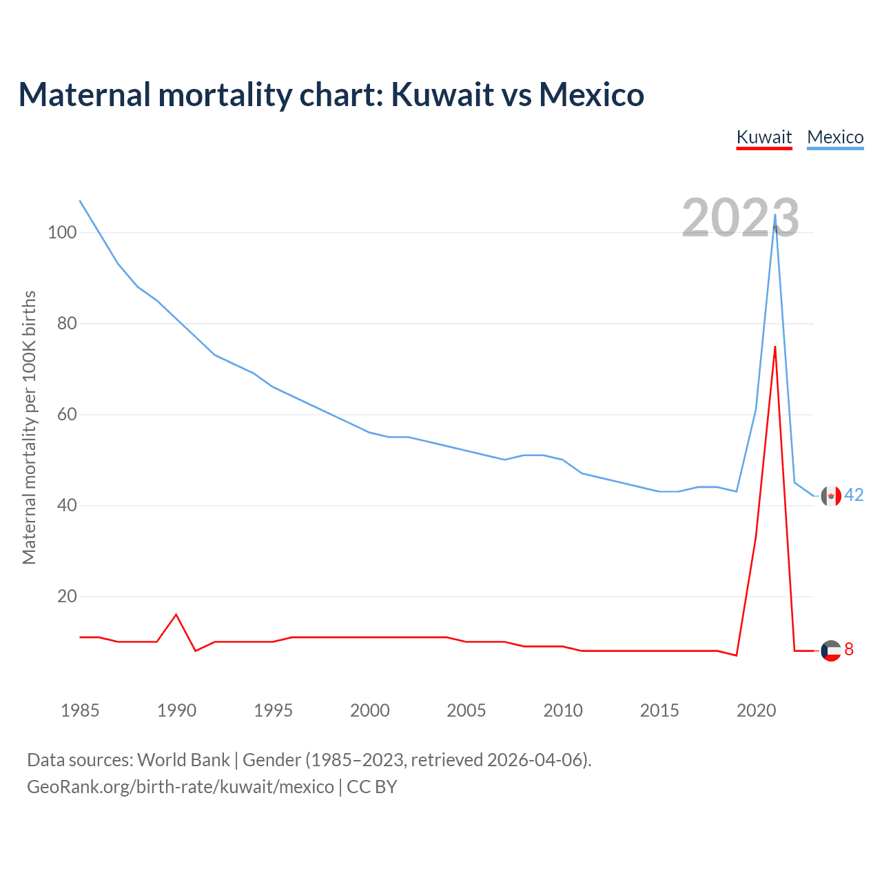 The maternal mortality rate, which is the probability of dying during childbirth or within 42 days of pregnancy termination, is 8 deaths per 100,000 live births in Kuwait, compared to 42 deaths in Mexico.