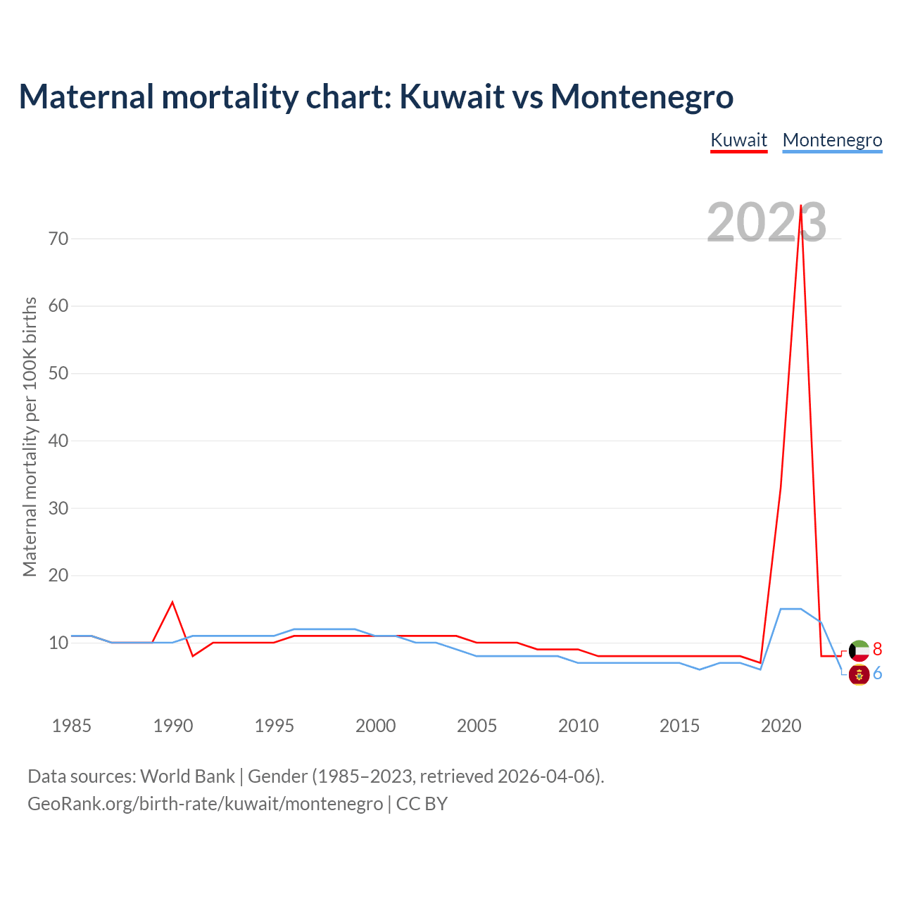 The maternal mortality rate, which is the probability of dying during childbirth or within 42 days of pregnancy termination, is 8 deaths per 100,000 live births in Kuwait, compared to 6 deaths in Montenegro.