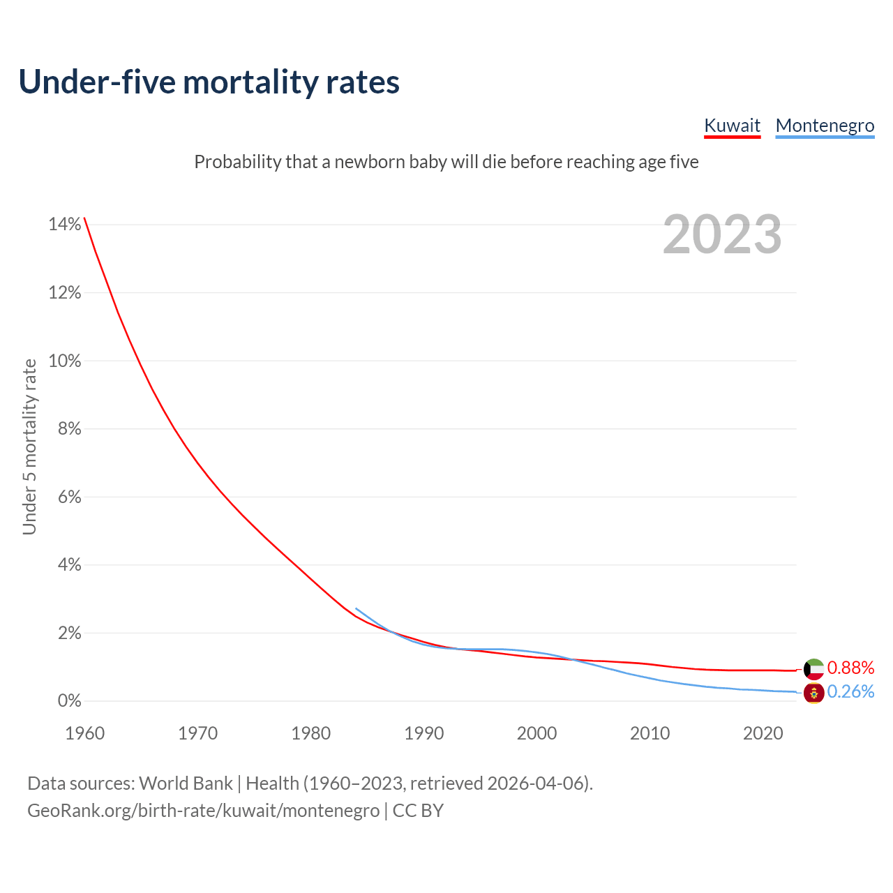 The chance that a newborn baby will die before reaching age five is 0.88% in Kuwait and 0.26% in Montenegro. Above is a chart with historical data on under-five mortality rates.