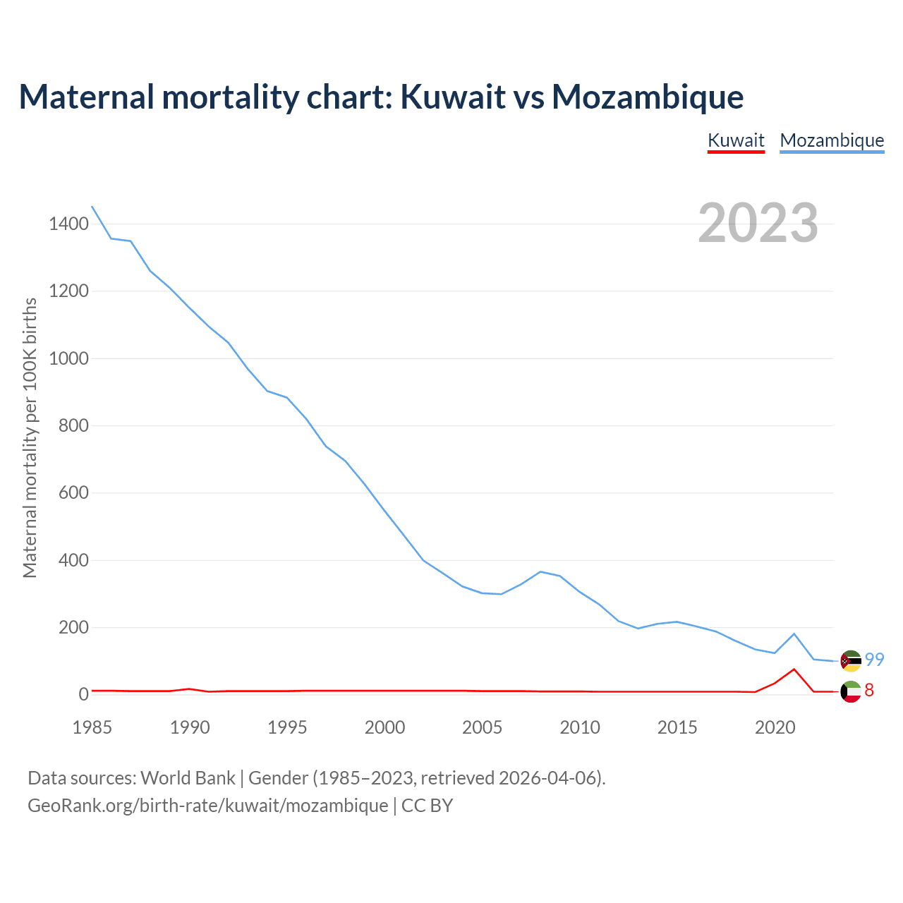 The maternal mortality rate, which is the probability of dying during childbirth or within 42 days of pregnancy termination, is 8 deaths per 100,000 live births in Kuwait, compared to 99 deaths in Mozambique.