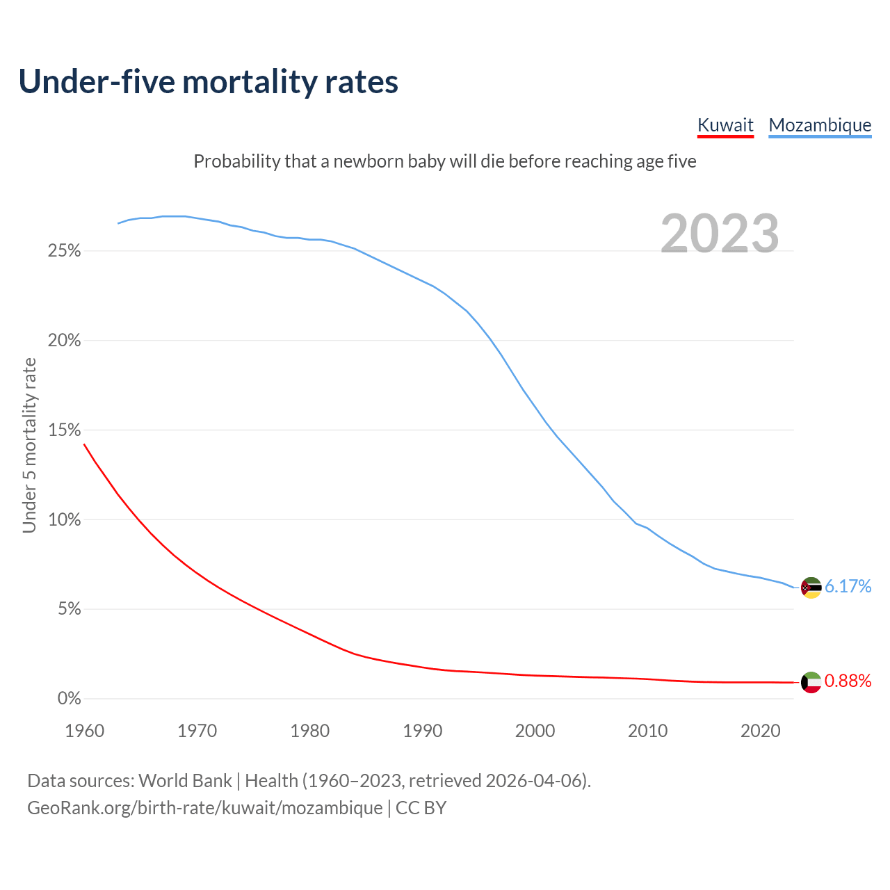 The chance that a newborn baby will die before reaching age five is 0.88% in Kuwait and 6.17% in Mozambique. Above is a chart with historical data on under-five mortality rates.