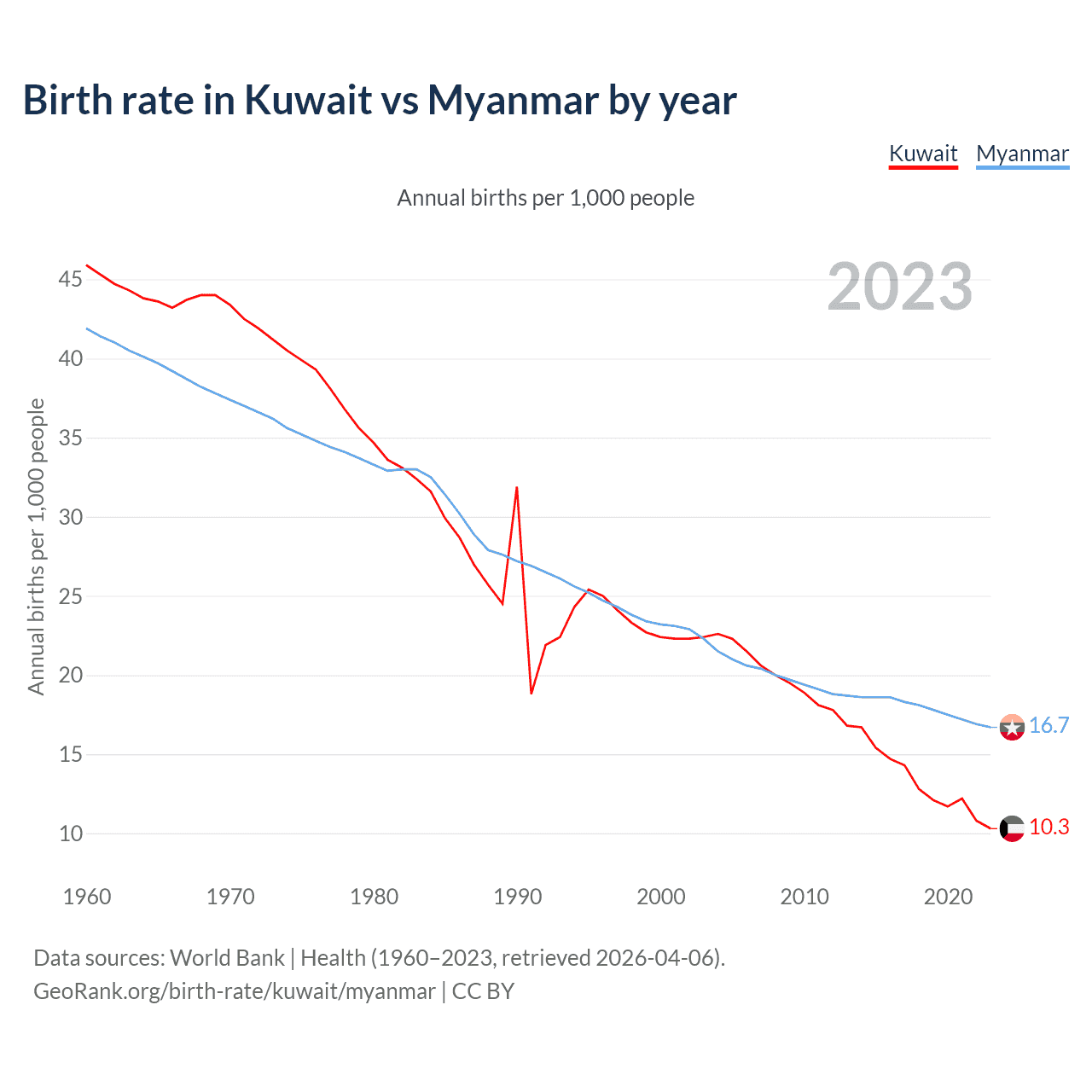 Kuwait has an annual birth rate of 10.3 births per 1,000 people, compared to 16.7 for Myanmar. The average number of children a woman is expected to have during her lifetime — the fertility rate, is 1.52 in Kuwait and 2.12 in Myanmar — 38.8% difference.