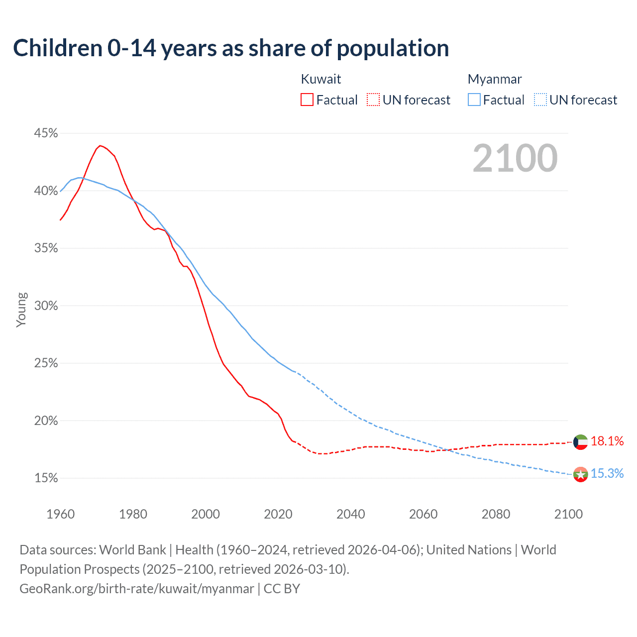 According to the latest available data on birth rates, the fertility rate in Kuwait was 1.52 children per woman in 2023, compared to 2.12 in Myanmar in 2023. The replacement level is considered to be 2.1 children per woman.