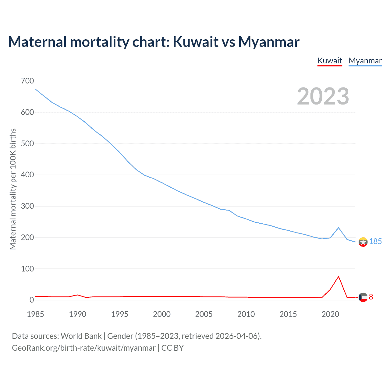 The maternal mortality rate, which is the probability of dying during childbirth or within 42 days of pregnancy termination, is 8 deaths per 100,000 live births in Kuwait, compared to 185 deaths in Myanmar.