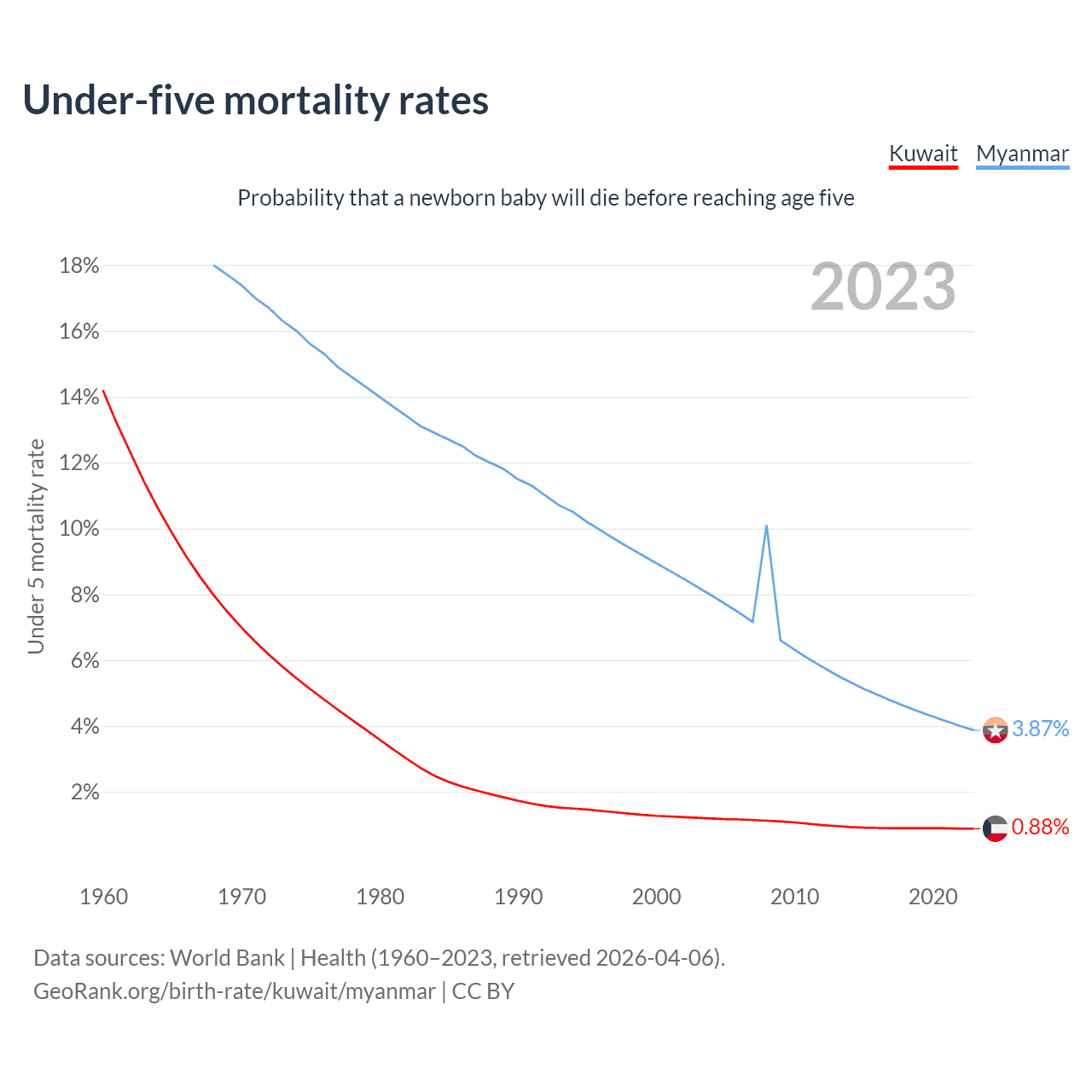 The chance that a newborn baby will die before reaching age five is 0.88% in Kuwait and 3.87% in Myanmar. Above is a chart with historical data on under-five mortality rates.
