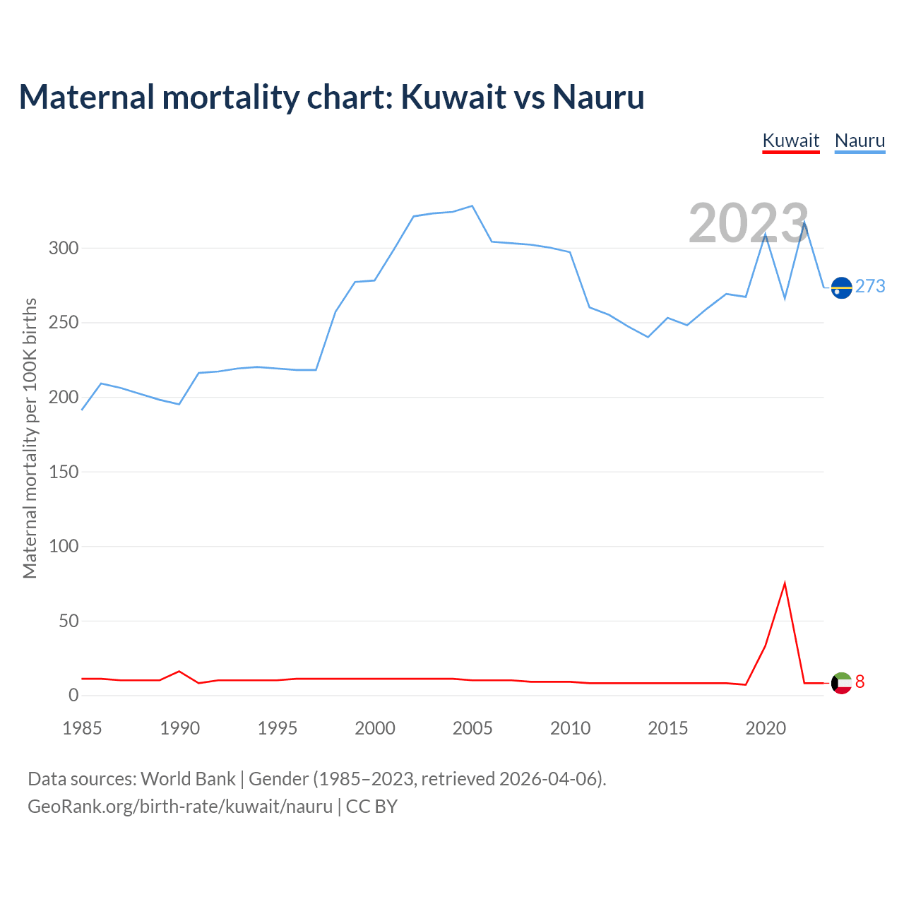 The maternal mortality rate, which is the probability of dying during childbirth or within 42 days of pregnancy termination, is 8 deaths per 100,000 live births in Kuwait, compared to 273 deaths in Nauru.