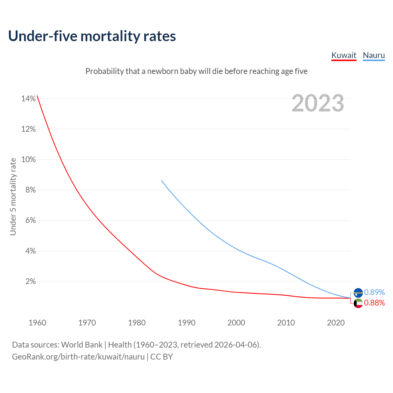 The chance that a newborn baby will die before reaching age five is 0.88% in Kuwait and 0.89% in Nauru. Above is a chart with historical data on under-five mortality rates.