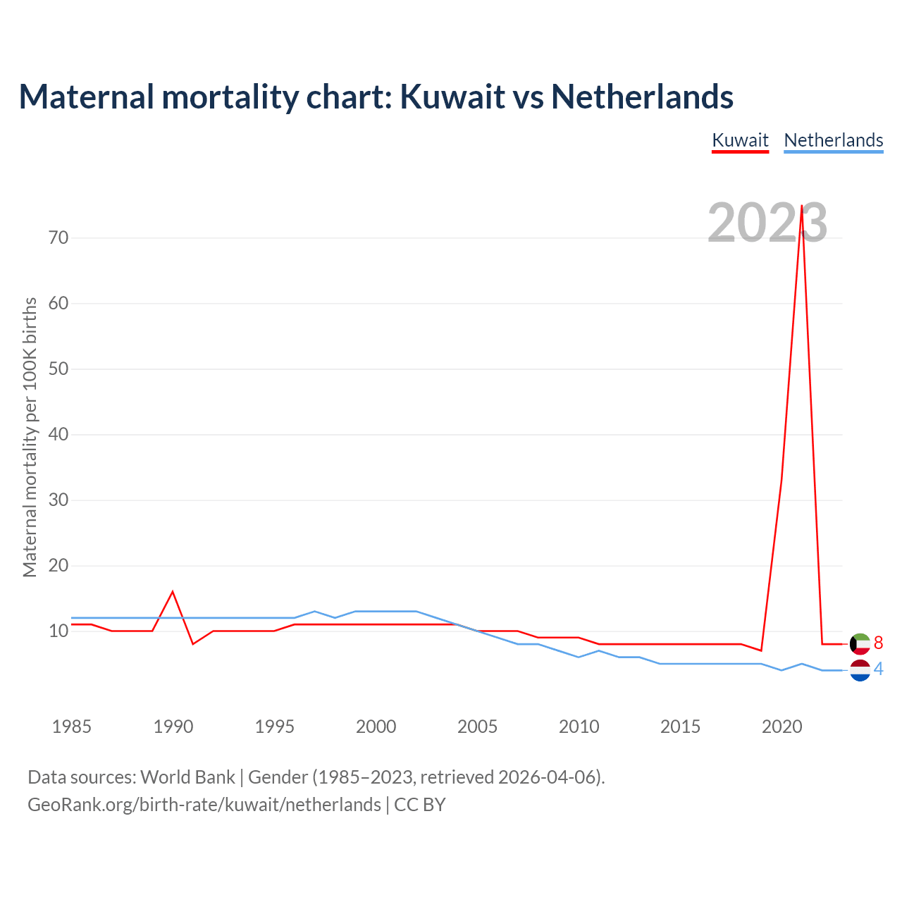 The maternal mortality rate, which is the probability of dying during childbirth or within 42 days of pregnancy termination, is 8 deaths per 100,000 live births in Kuwait, compared to 4 deaths in the Netherlands.