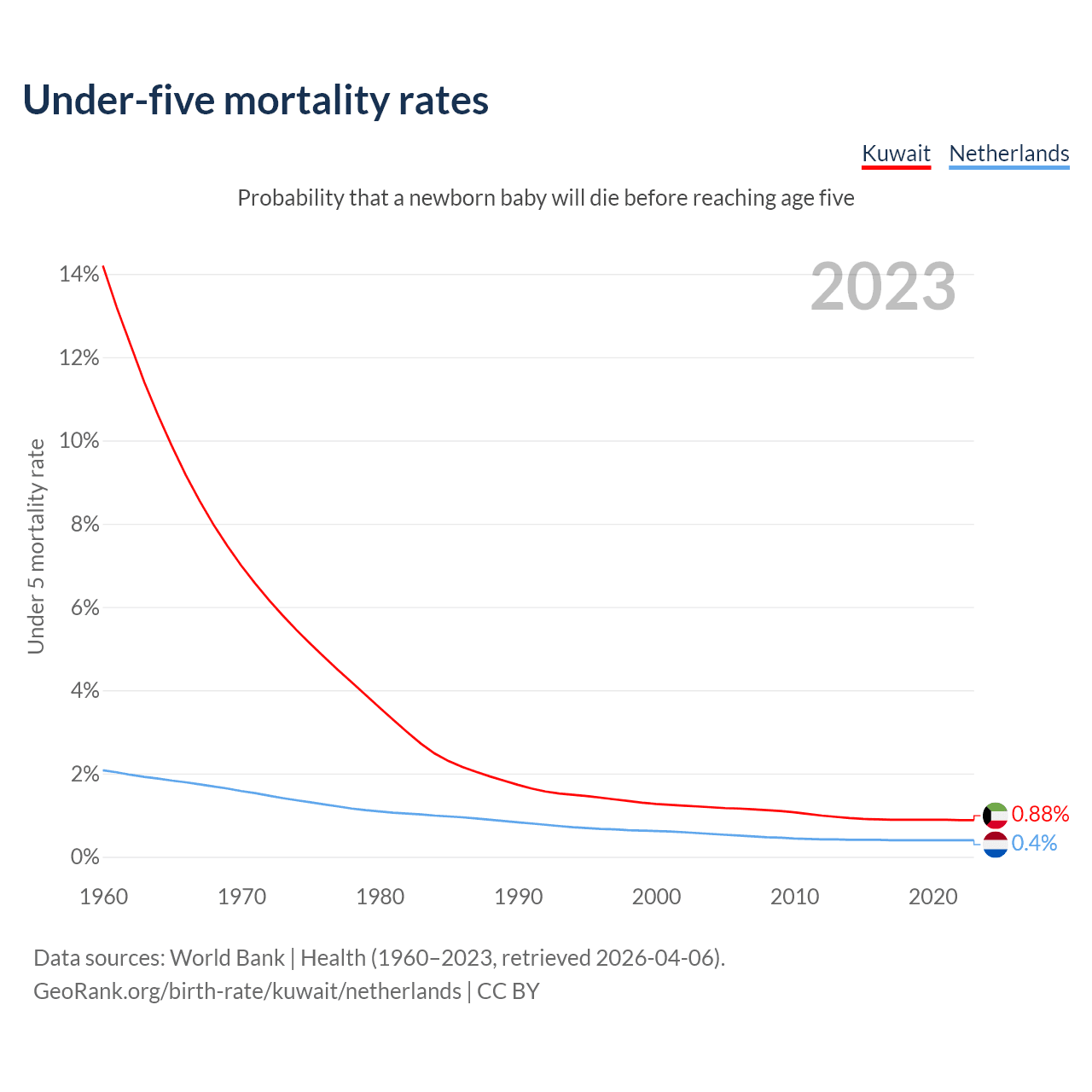 The chance that a newborn baby will die before reaching age five is 0.88% in Kuwait and 0.4% in the Netherlands. Above is a chart with historical data on under-five mortality rates.