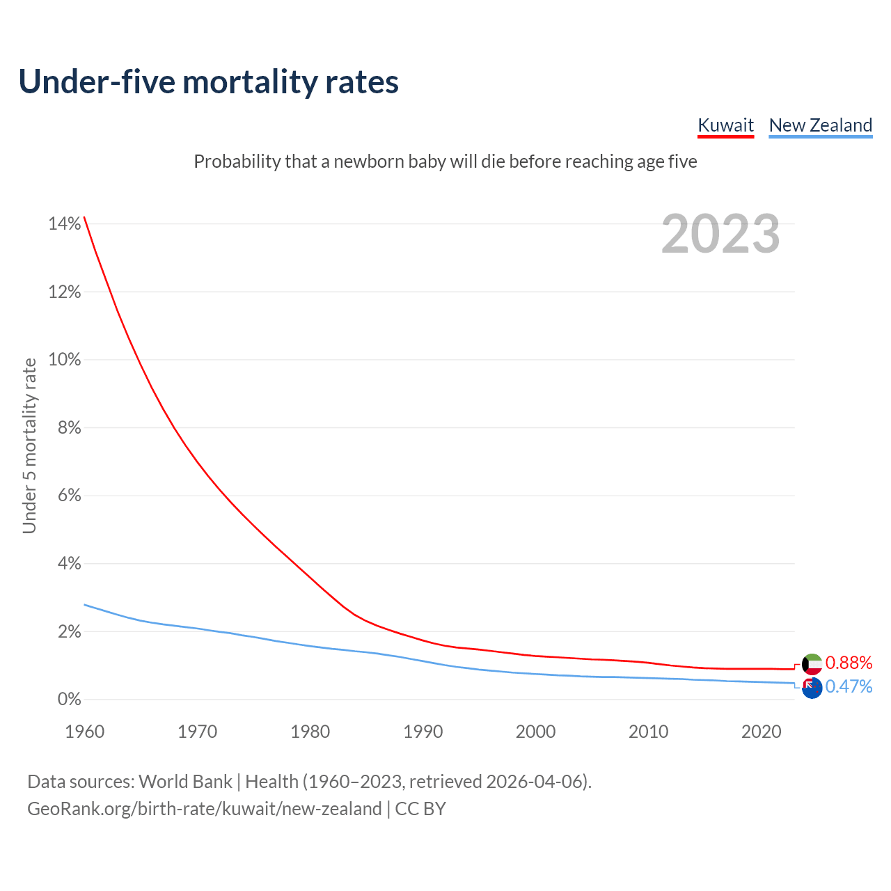 The chance that a newborn baby will die before reaching age five is 0.88% in Kuwait and 0.47% in New Zealand. Above is a chart with historical data on under-five mortality rates.