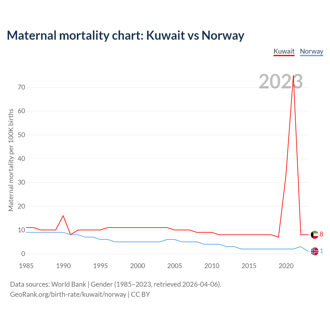 The maternal mortality rate, which is the probability of dying during childbirth or within 42 days of pregnancy termination, is 8 deaths per 100,000 live births in Kuwait, compared to 1 deaths in Norway.
