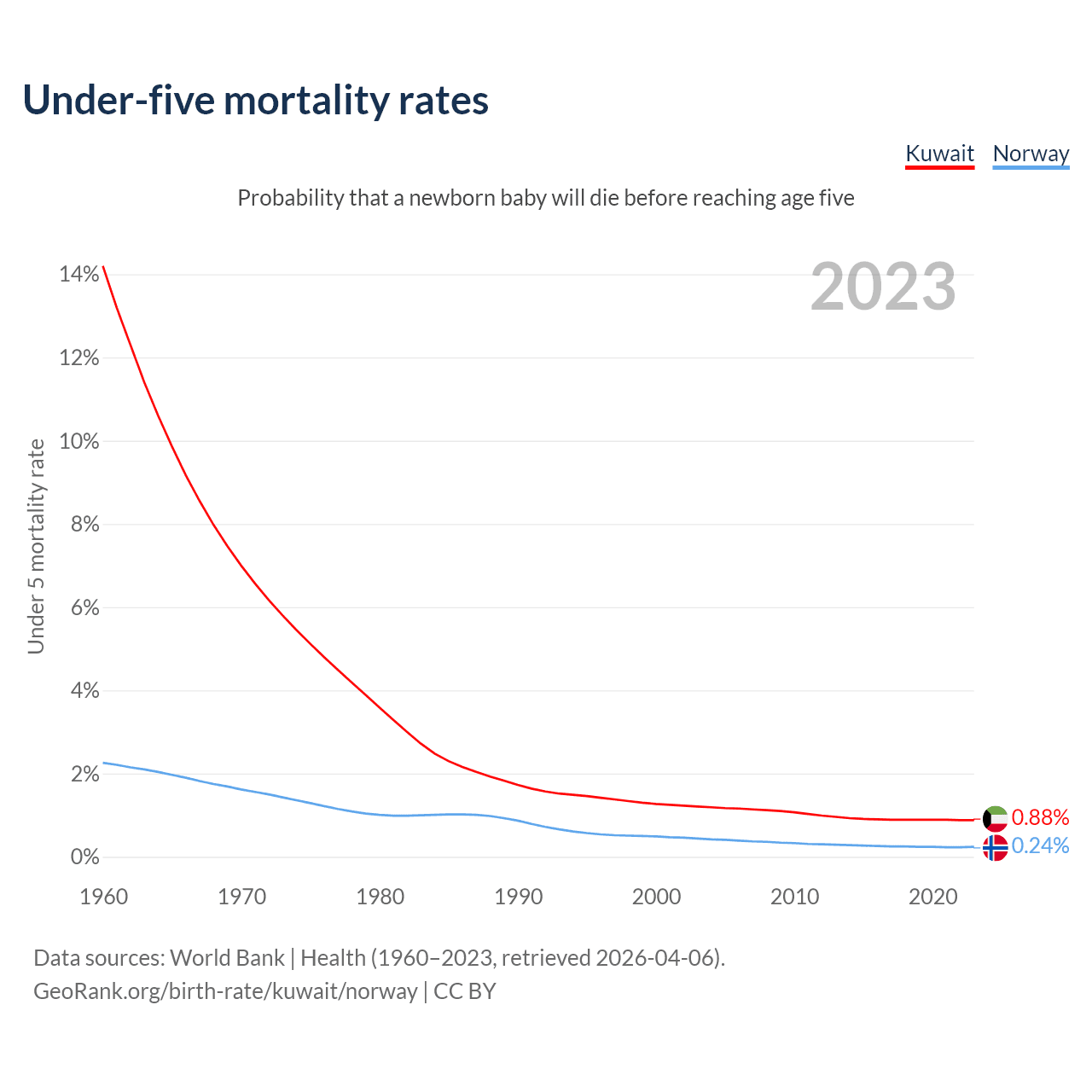 The chance that a newborn baby will die before reaching age five is 0.88% in Kuwait and 0.24% in Norway. Above is a chart with historical data on under-five mortality rates.