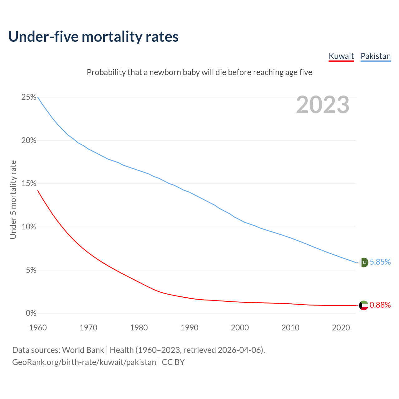 The chance that a newborn baby will die before reaching age five is 0.88% in Kuwait and 5.85% in Pakistan. Above is a chart with historical data on under-five mortality rates.