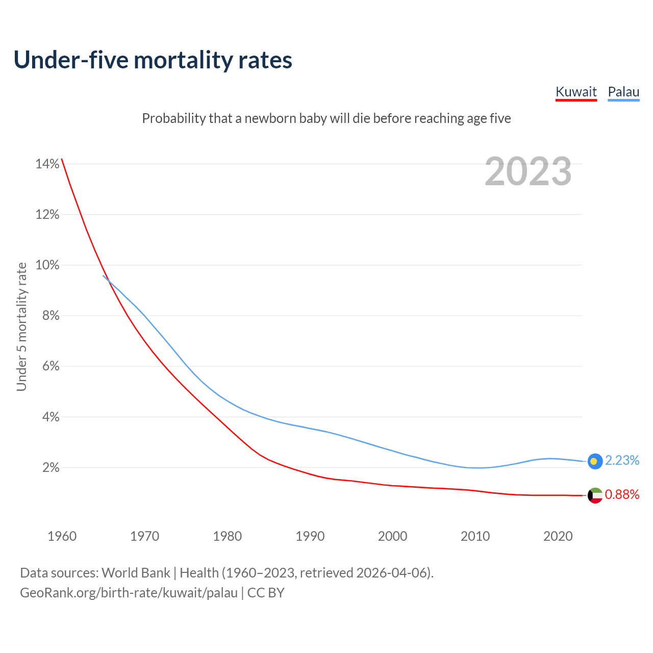 The chance that a newborn baby will die before reaching age five is 0.88% in Kuwait and 2.23% in Palau. Above is a chart with historical data on under-five mortality rates.