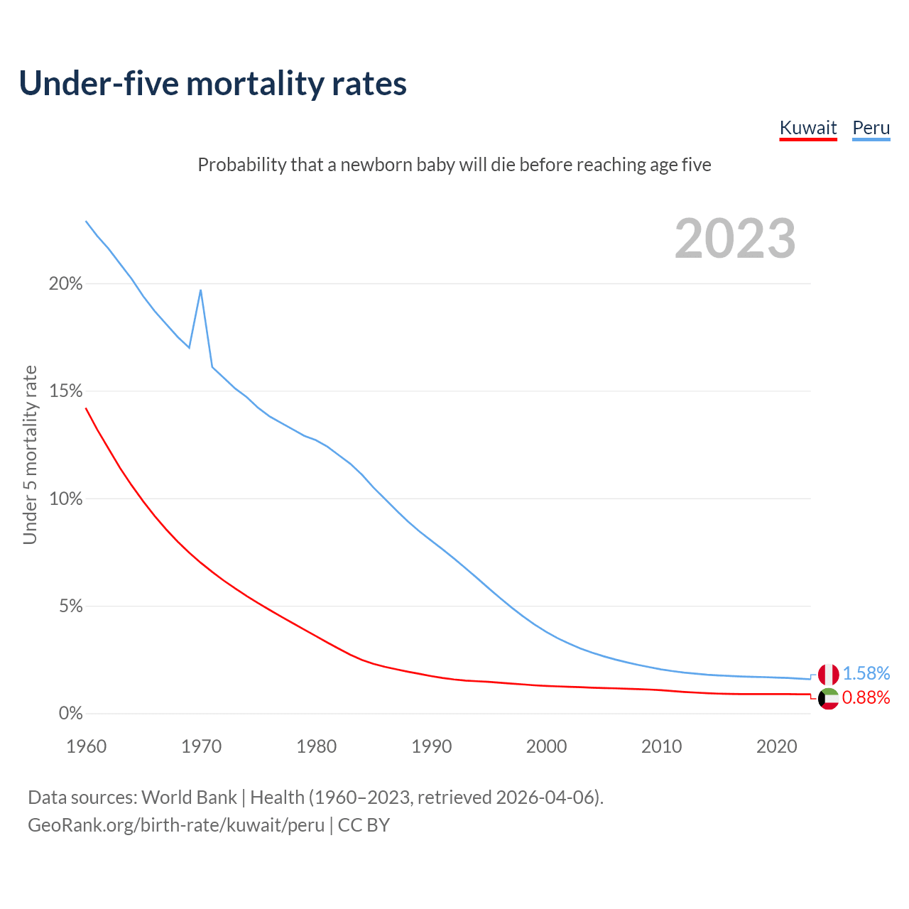 The chance that a newborn baby will die before reaching age five is 0.88% in Kuwait and 1.58% in Peru. Above is a chart with historical data on under-five mortality rates.