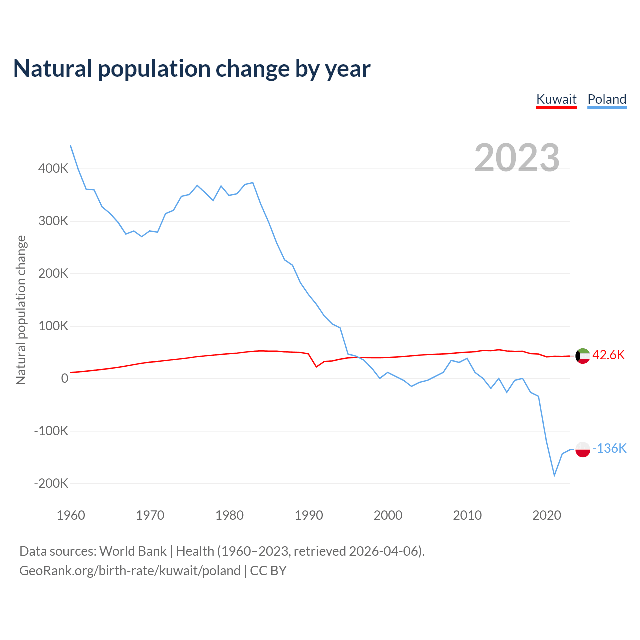 Kuwait has an annual birth rate of 10.3 births per 1,000 people, compared to 7.4 for Poland. The average number of children a woman is expected to have during her lifetime — the fertility rate, is 1.52 in Kuwait and 1.16 in Poland — 24% difference.