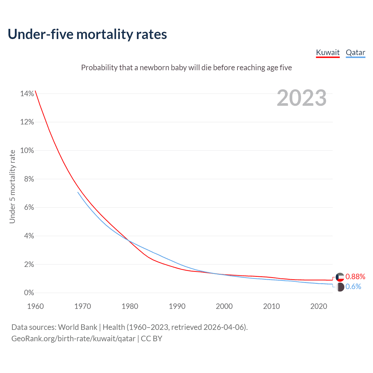 The chance that a newborn baby will die before reaching age five is 0.88% in Kuwait and 0.6% in Qatar. Above is a chart with historical data on under-five mortality rates.