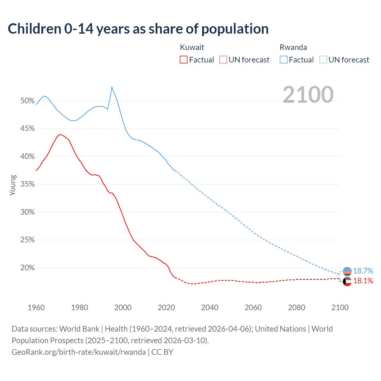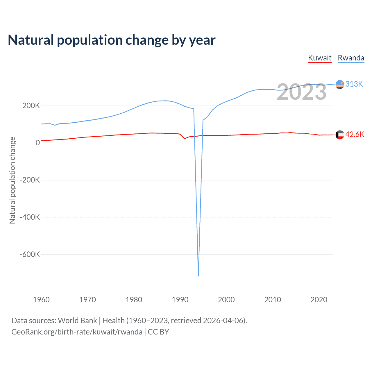 Kuwait has an annual birth rate of 10.3 births per 1,000 people, compared to 28.3 for Rwanda. The average number of children a woman is expected to have during her lifetime — the fertility rate, is 1.52 in Kuwait and 3.7 in Rwanda — 142.7% difference.