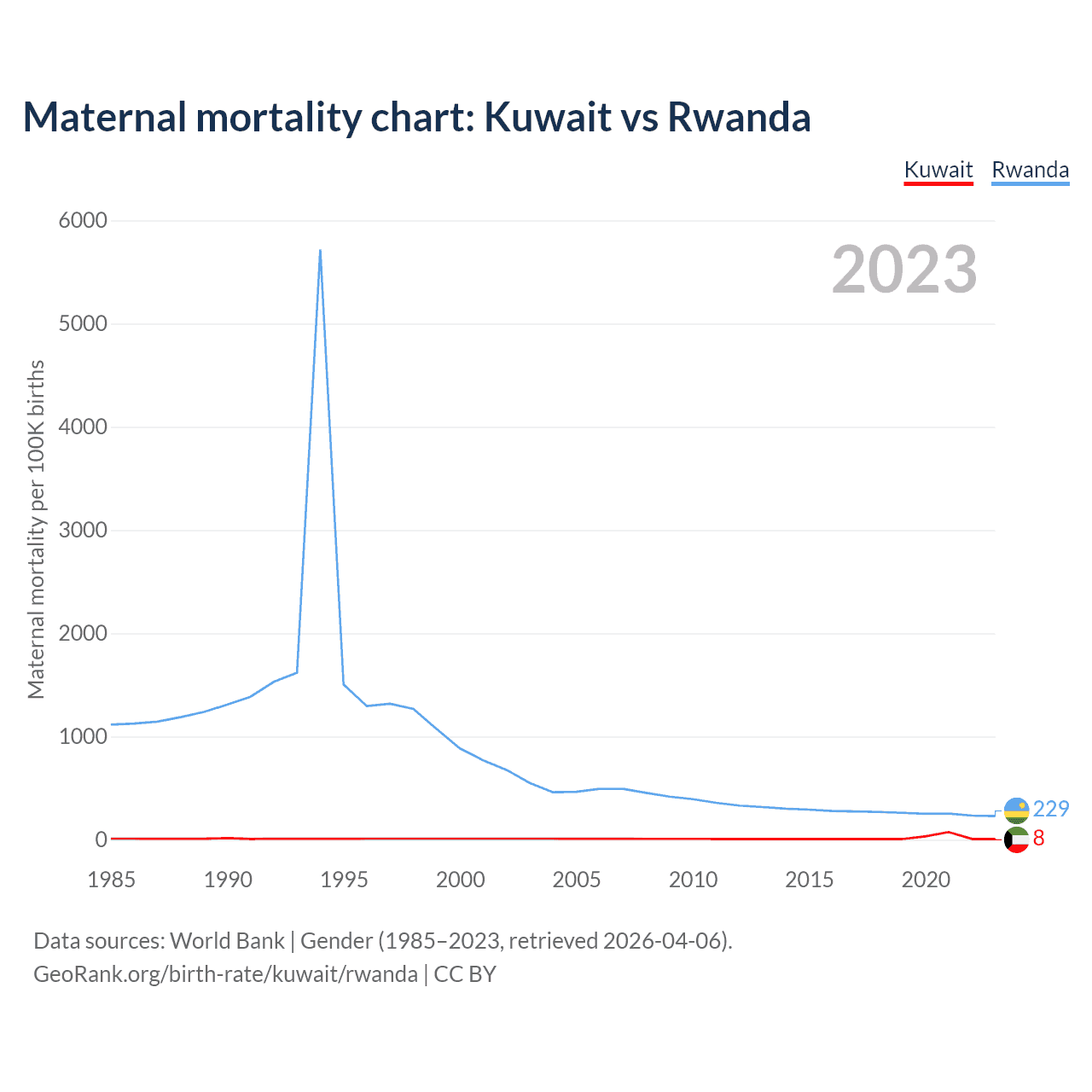 The maternal mortality rate, which is the probability of dying during childbirth or within 42 days of pregnancy termination, is 8 deaths per 100,000 live births in Kuwait, compared to 229 deaths in Rwanda.