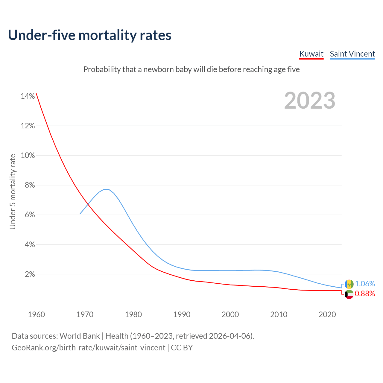 The chance that a newborn baby will die before reaching age five is 0.88% in Kuwait and 1.06% in Saint Vincent. Above is a chart with historical data on under-five mortality rates.