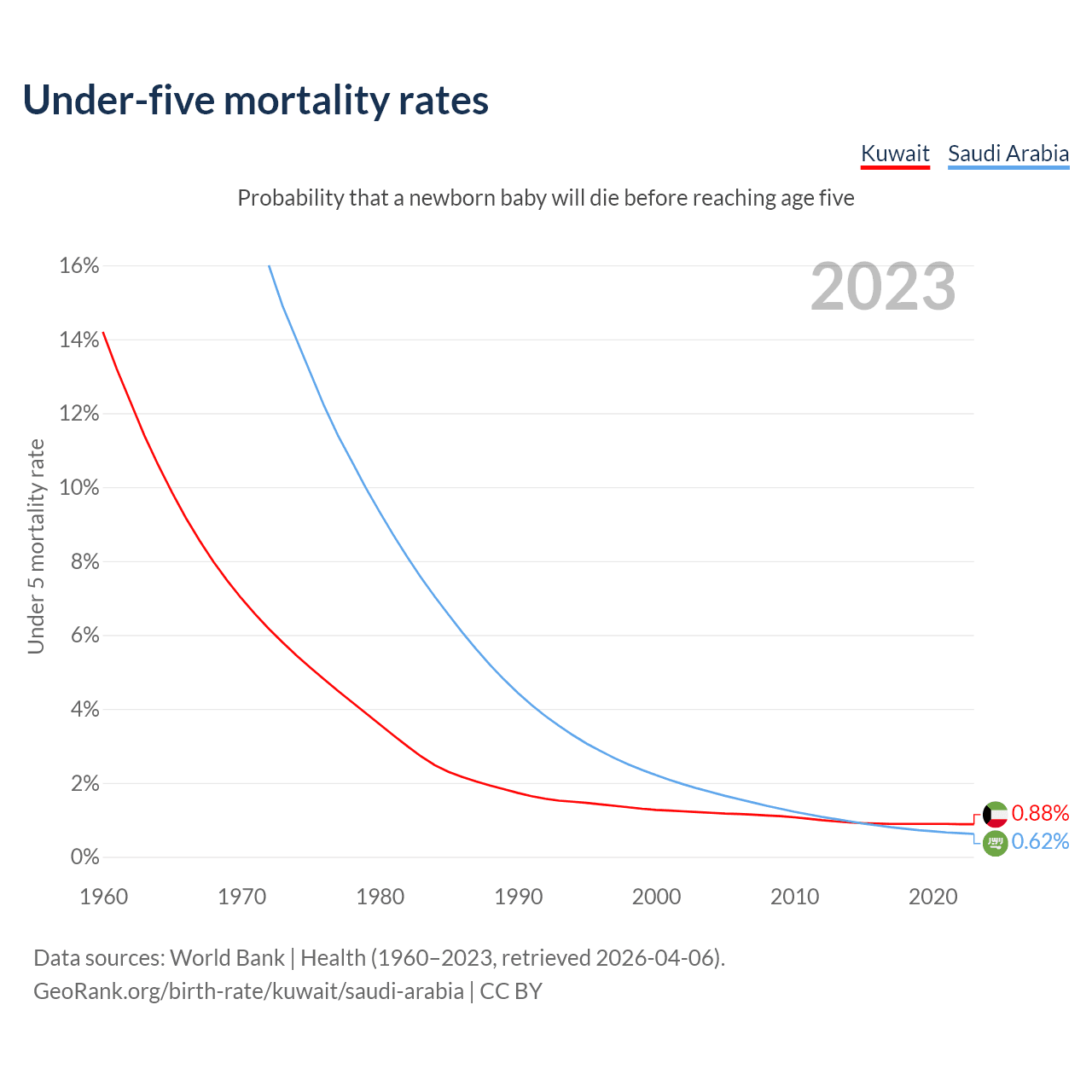 The chance that a newborn baby will die before reaching age five is 0.88% in Kuwait and 0.62% in Saudi Arabia. Above is a chart with historical data on under-five mortality rates.
