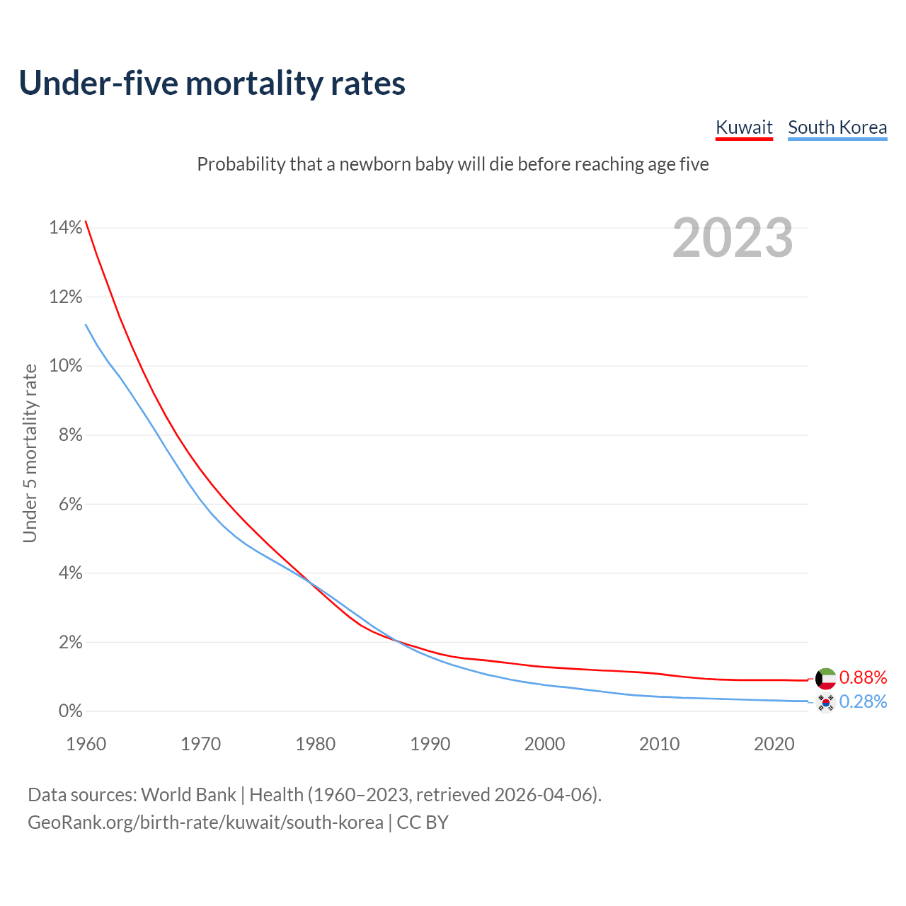 The chance that a newborn baby will die before reaching age five is 0.88% in Kuwait and 0.28% in South Korea. Above is a chart with historical data on under-five mortality rates.