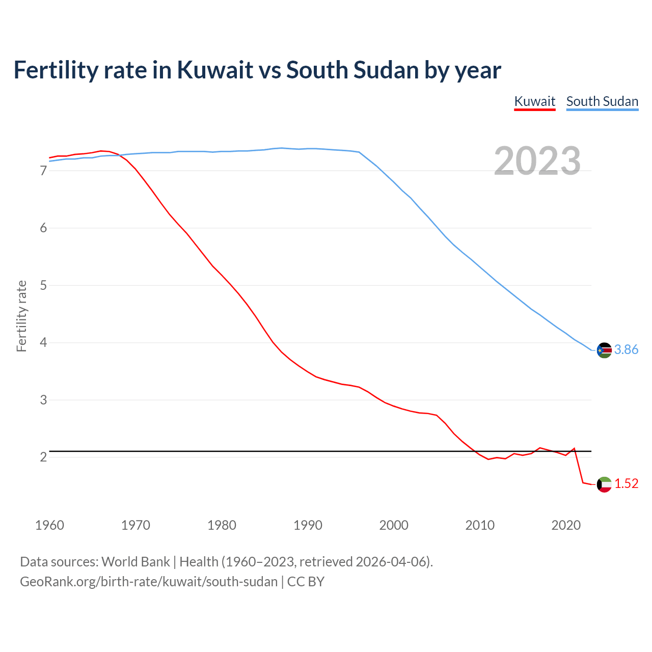 1960 vs 2023, the fertility rate has decreased by 78.9% in Kuwait and by 46% in South Sudan — in 1960, it was 7.22 and 7.16, respectively.