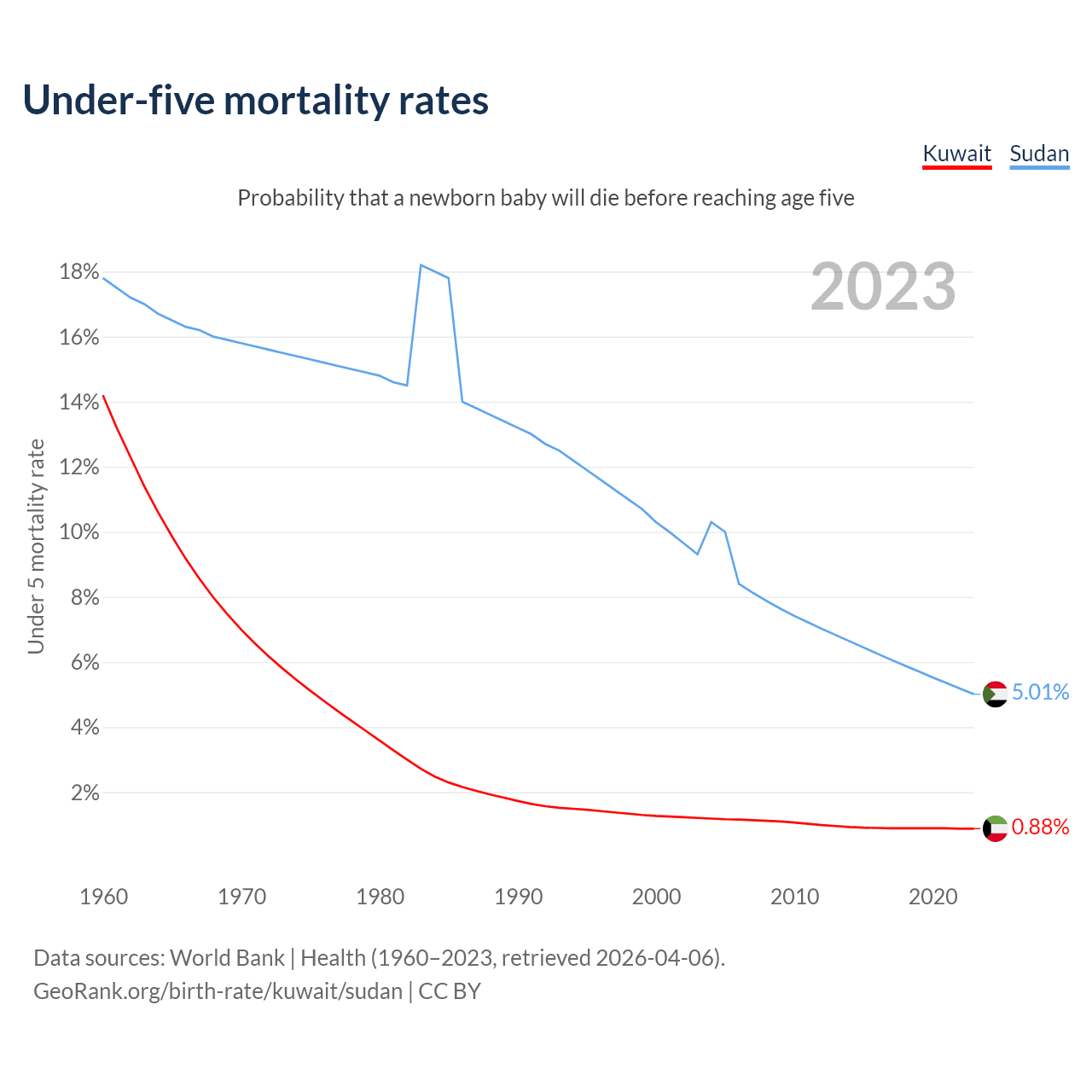 The chance that a newborn baby will die before reaching age five is 0.88% in Kuwait and 5.01% in Sudan. Above is a chart with historical data on under-five mortality rates.