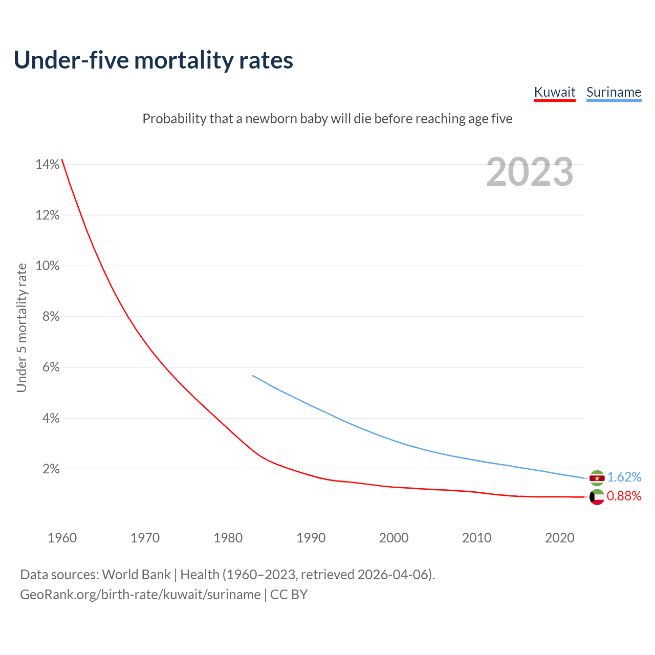 The chance that a newborn baby will die before reaching age five is 0.88% in Kuwait and 1.62% in Suriname. Above is a chart with historical data on under-five mortality rates.