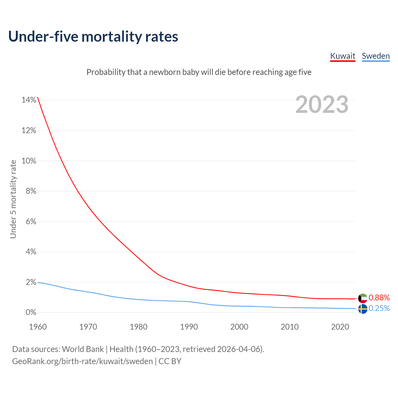 The chance that a newborn baby will die before reaching age five is 0.88% in Kuwait and 0.25% in Sweden. Above is a chart with historical data on under-five mortality rates.