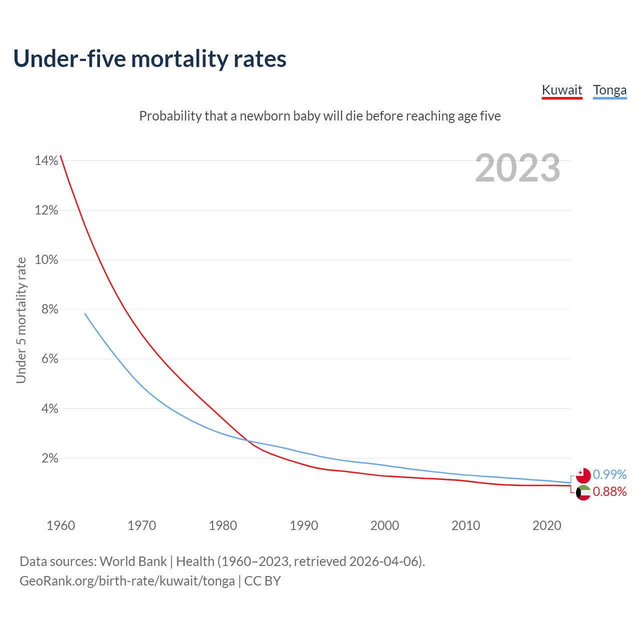 The chance that a newborn baby will die before reaching age five is 0.88% in Kuwait and 0.99% in Tonga. Above is a chart with historical data on under-five mortality rates.
