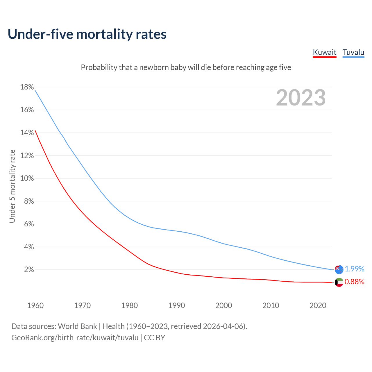 The chance that a newborn baby will die before reaching age five is 0.88% in Kuwait and 1.99% in Tuvalu. Above is a chart with historical data on under-five mortality rates.