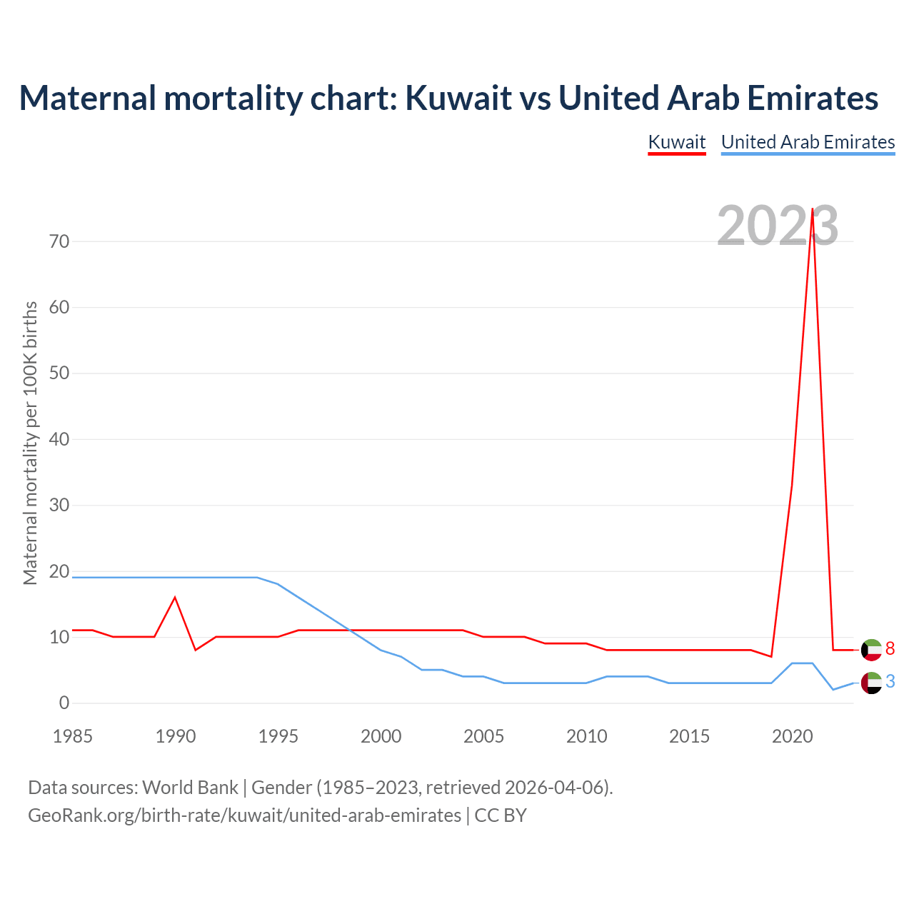 The maternal mortality rate, which is the probability of dying during childbirth or within 42 days of pregnancy termination, is 8 deaths per 100,000 live births in Kuwait, compared to 3 deaths in the United Arab Emirates.