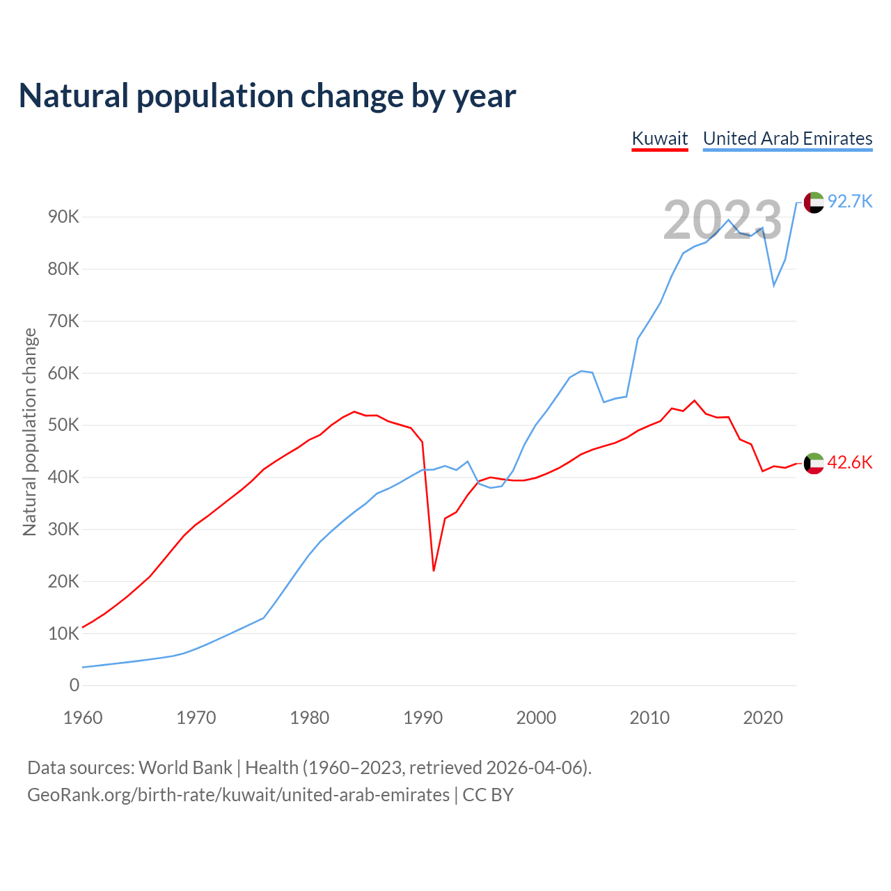 Kuwait has an annual birth rate of 10.3 births per 1,000 people, compared to 9.77 for the United Arab Emirates. The average number of children a woman is expected to have during her lifetime — the fertility rate, is 1.52 in Kuwait and 1.2 in the United Arab Emirates — 21.3% difference.