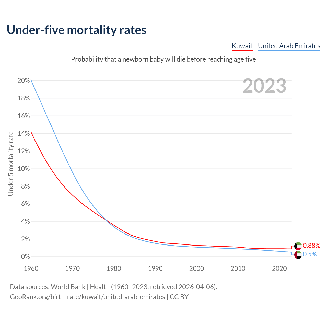 The chance that a newborn baby will die before reaching age five is 0.88% in Kuwait and 0.5% in the United Arab Emirates. Above is a chart with historical data on under-five mortality rates.