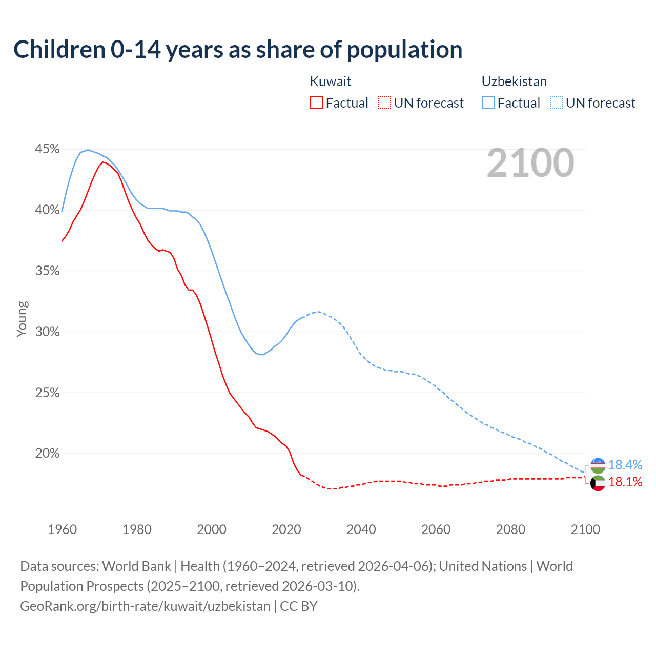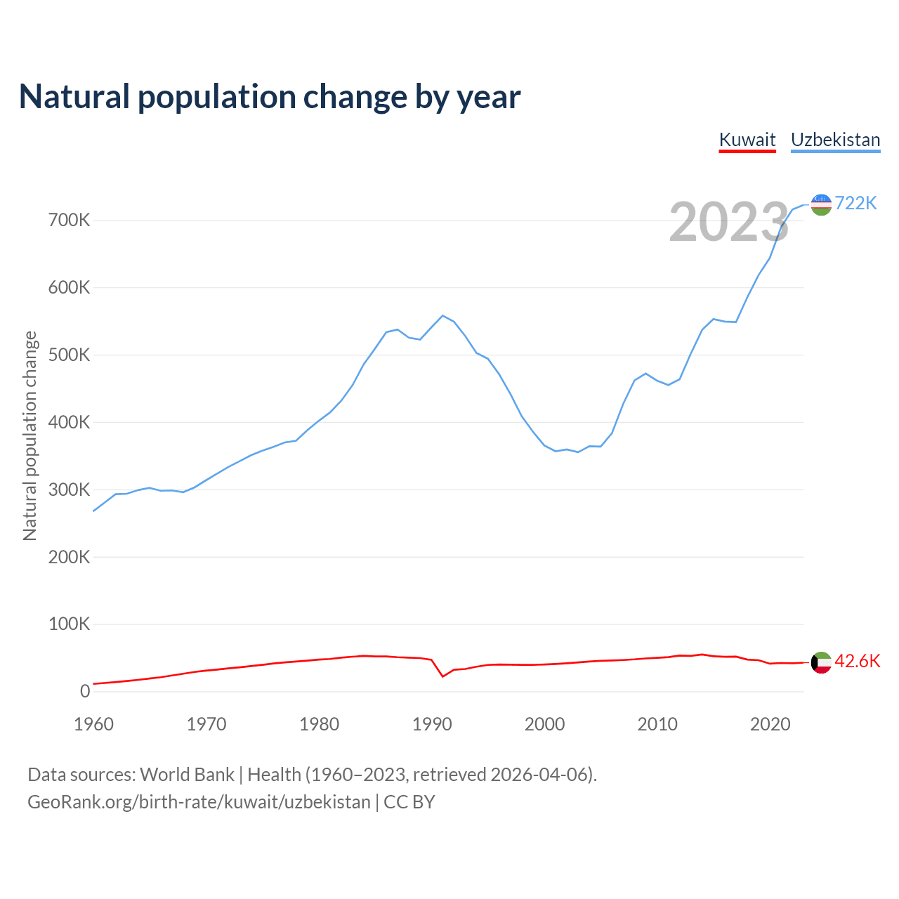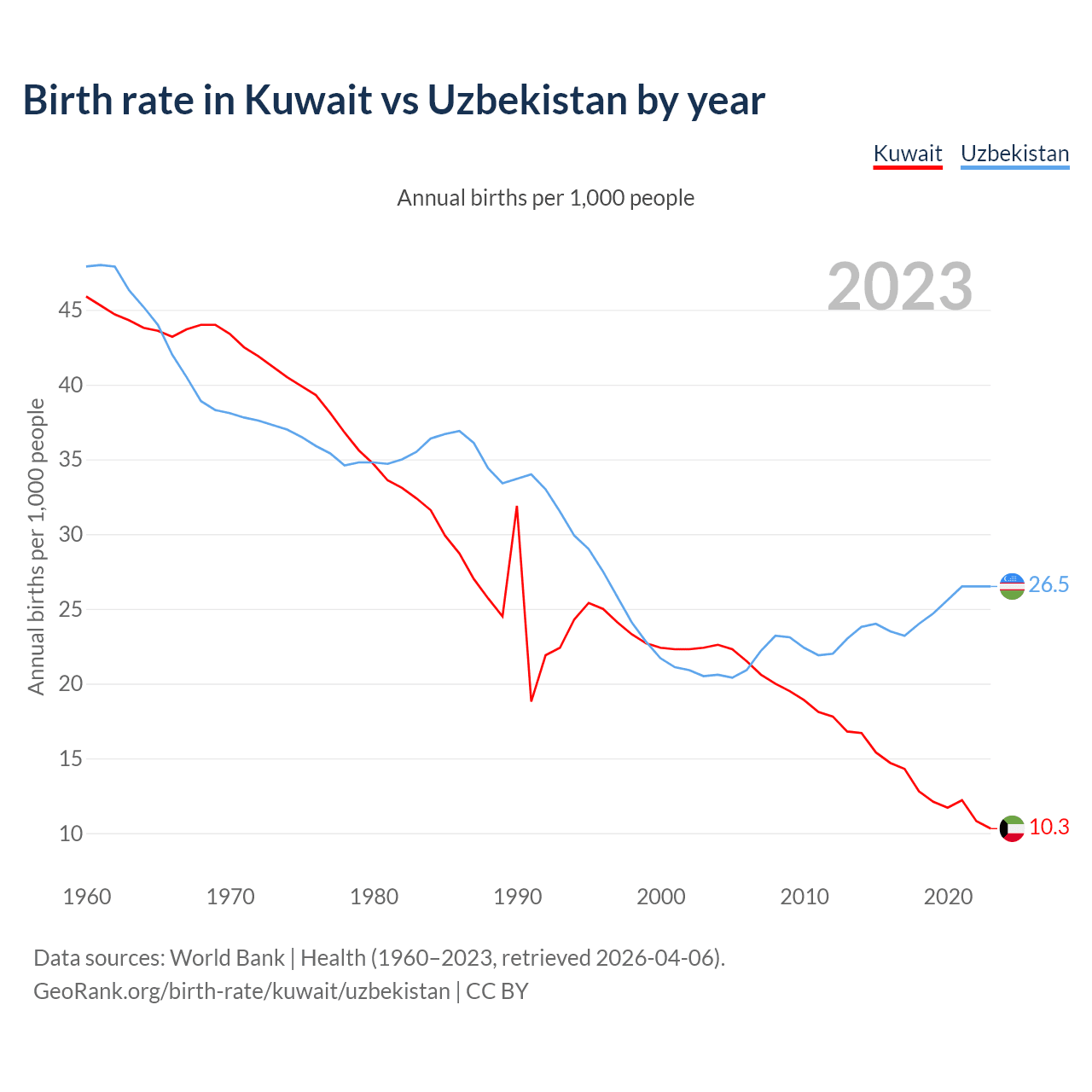 Kuwait has an annual birth rate of 10.3 births per 1,000 people, compared to 26.5 for Uzbekistan. The average number of children a woman is expected to have during her lifetime — the fertility rate, is 1.52 in Kuwait and 3.5 in Uzbekistan — 129.7% difference.
