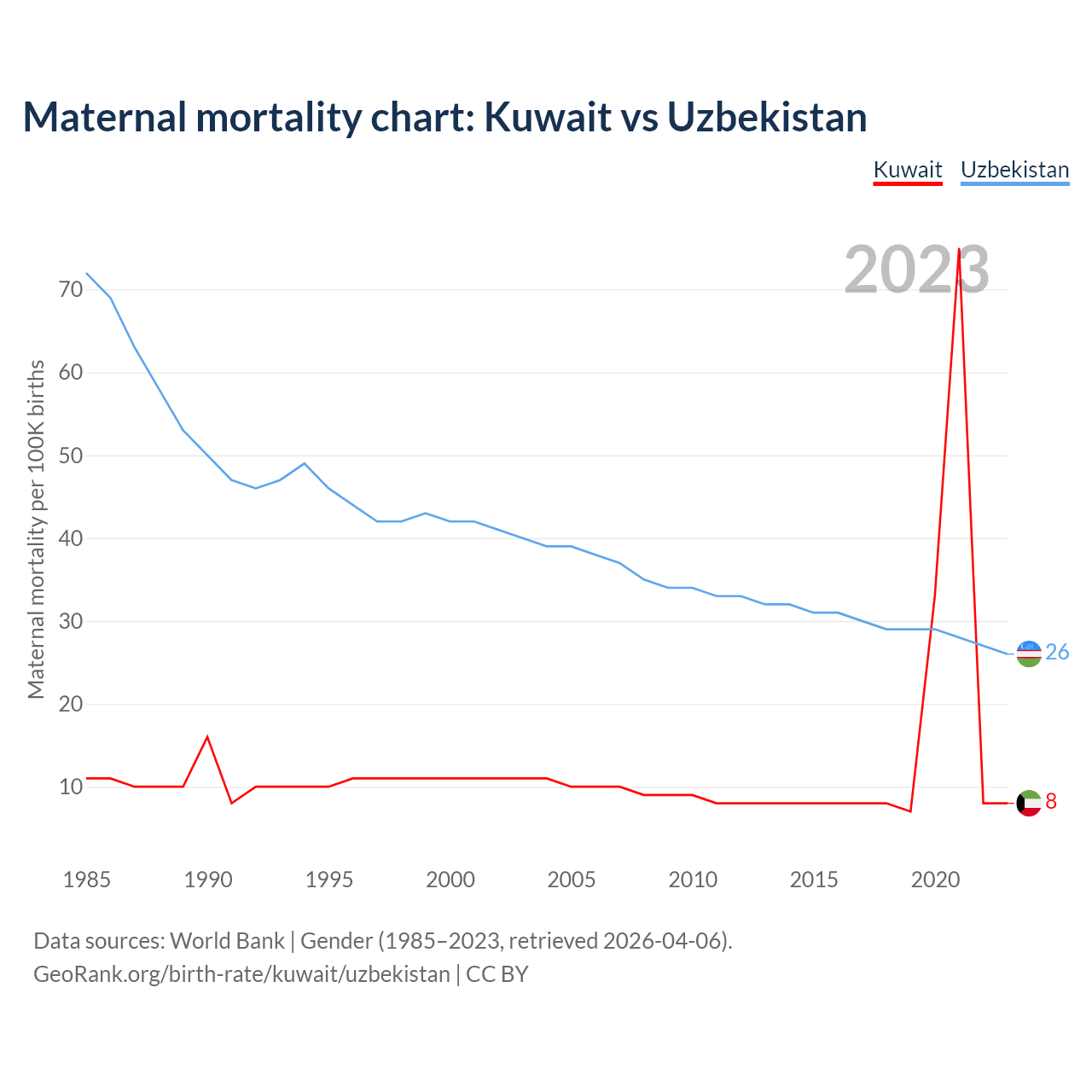 The maternal mortality rate, which is the probability of dying during childbirth or within 42 days of pregnancy termination, is 8 deaths per 100,000 live births in Kuwait, compared to 26 deaths in Uzbekistan.