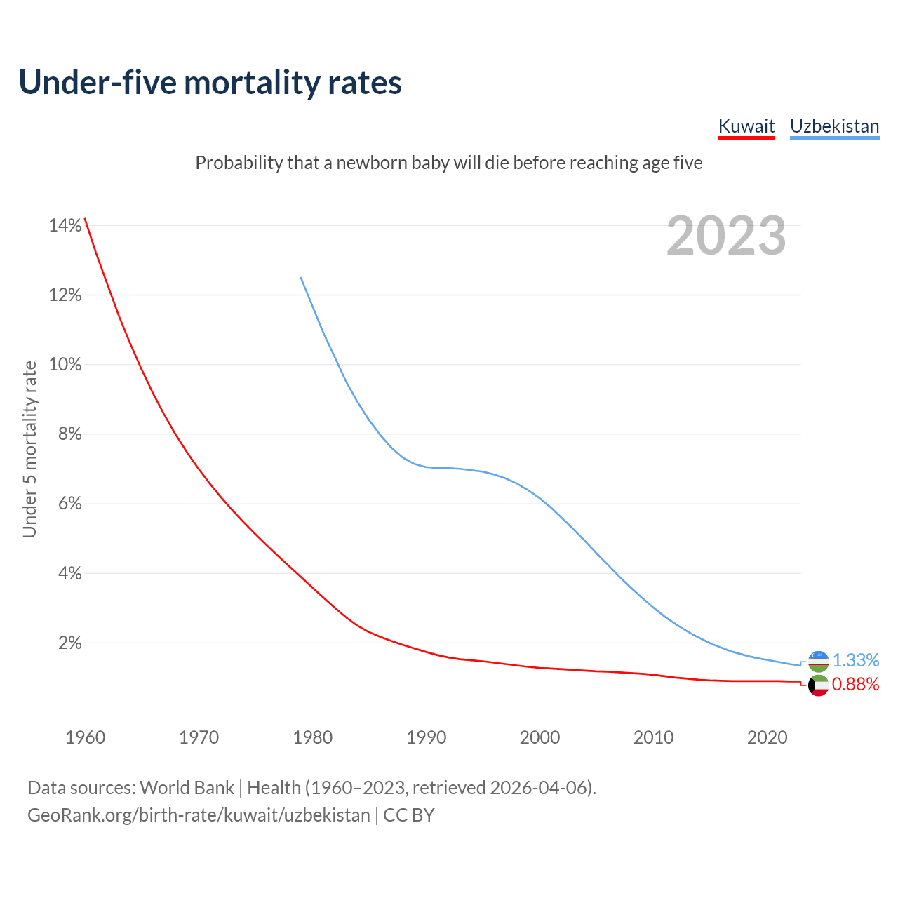 The chance that a newborn baby will die before reaching age five is 0.88% in Kuwait and 1.33% in Uzbekistan. Above is a chart with historical data on under-five mortality rates.