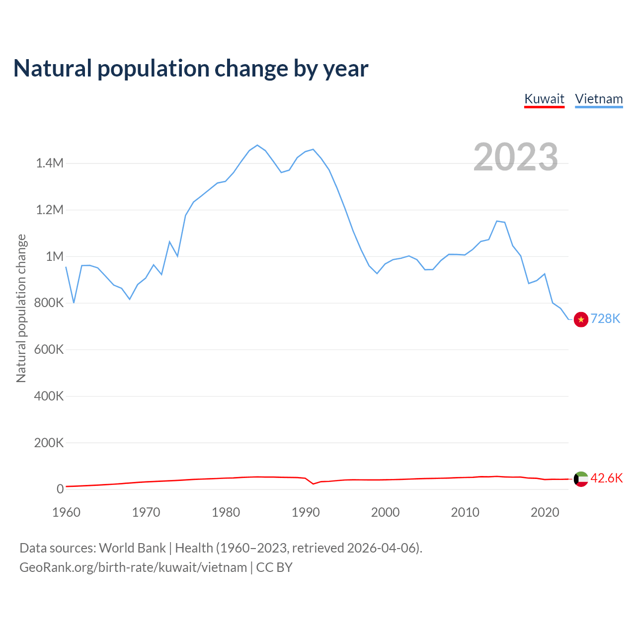 According to the latest available data on birth rates, the fertility rate in Kuwait was 1.52 children per woman in 2023, compared to 1.91 in Vietnam in 2023. The replacement level is considered to be 2.1 children per woman.