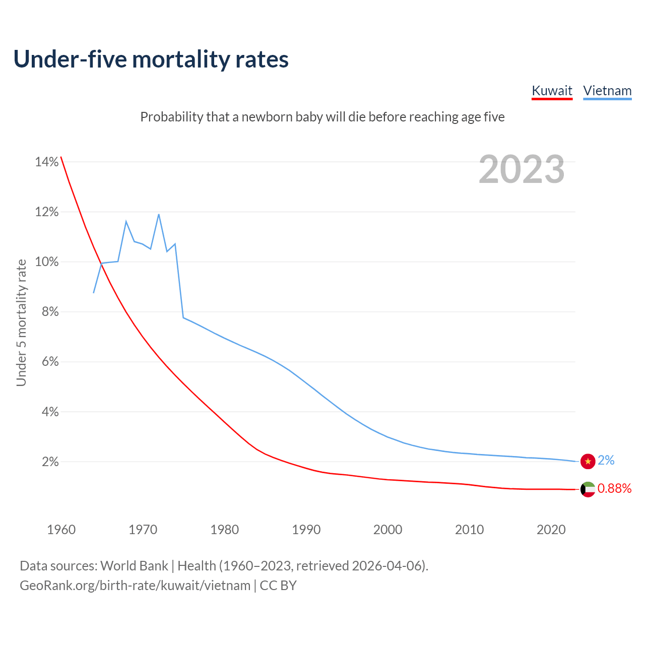 The chance that a newborn baby will die before reaching age five is 0.88% in Kuwait and 2% in Vietnam. Above is a chart with historical data on under-five mortality rates.