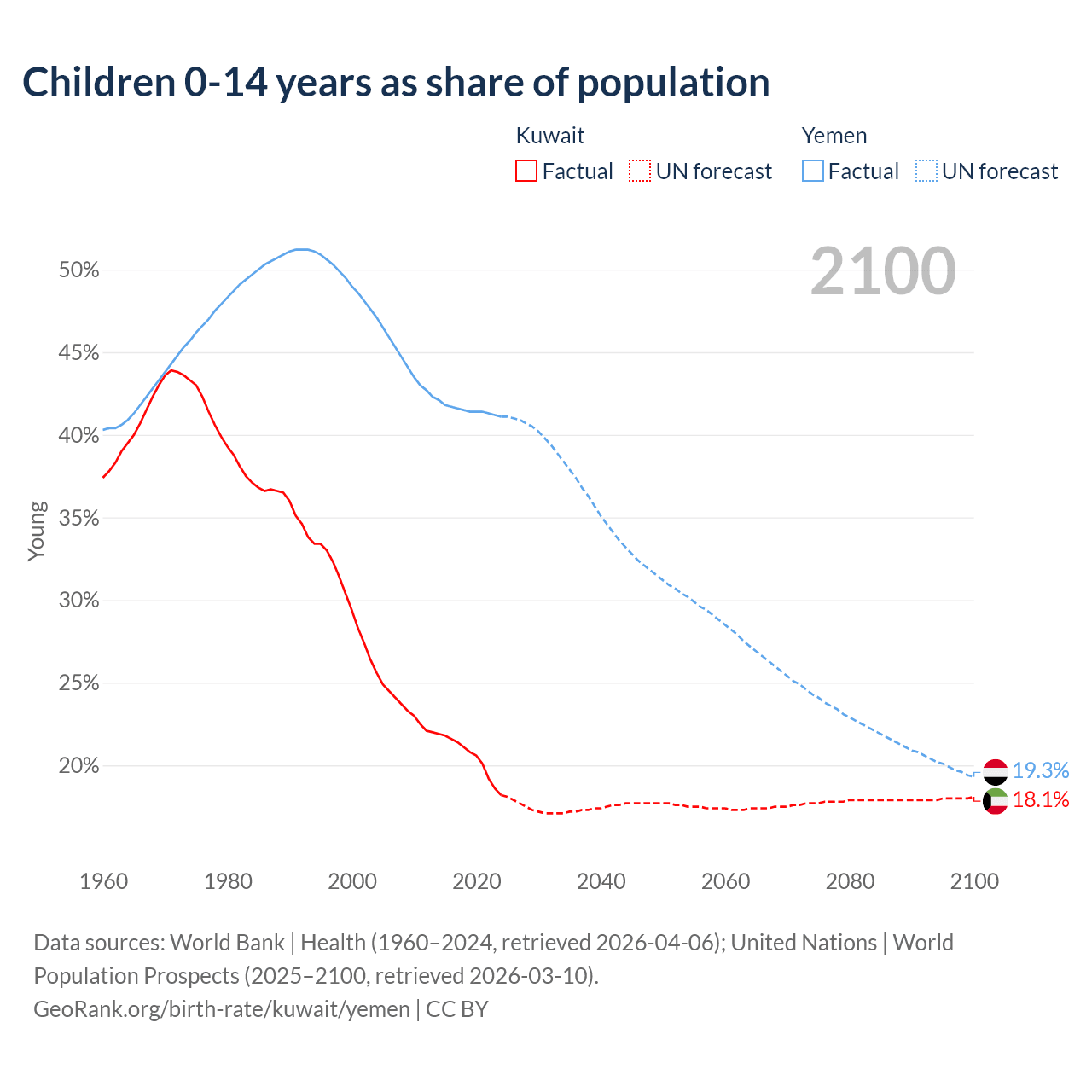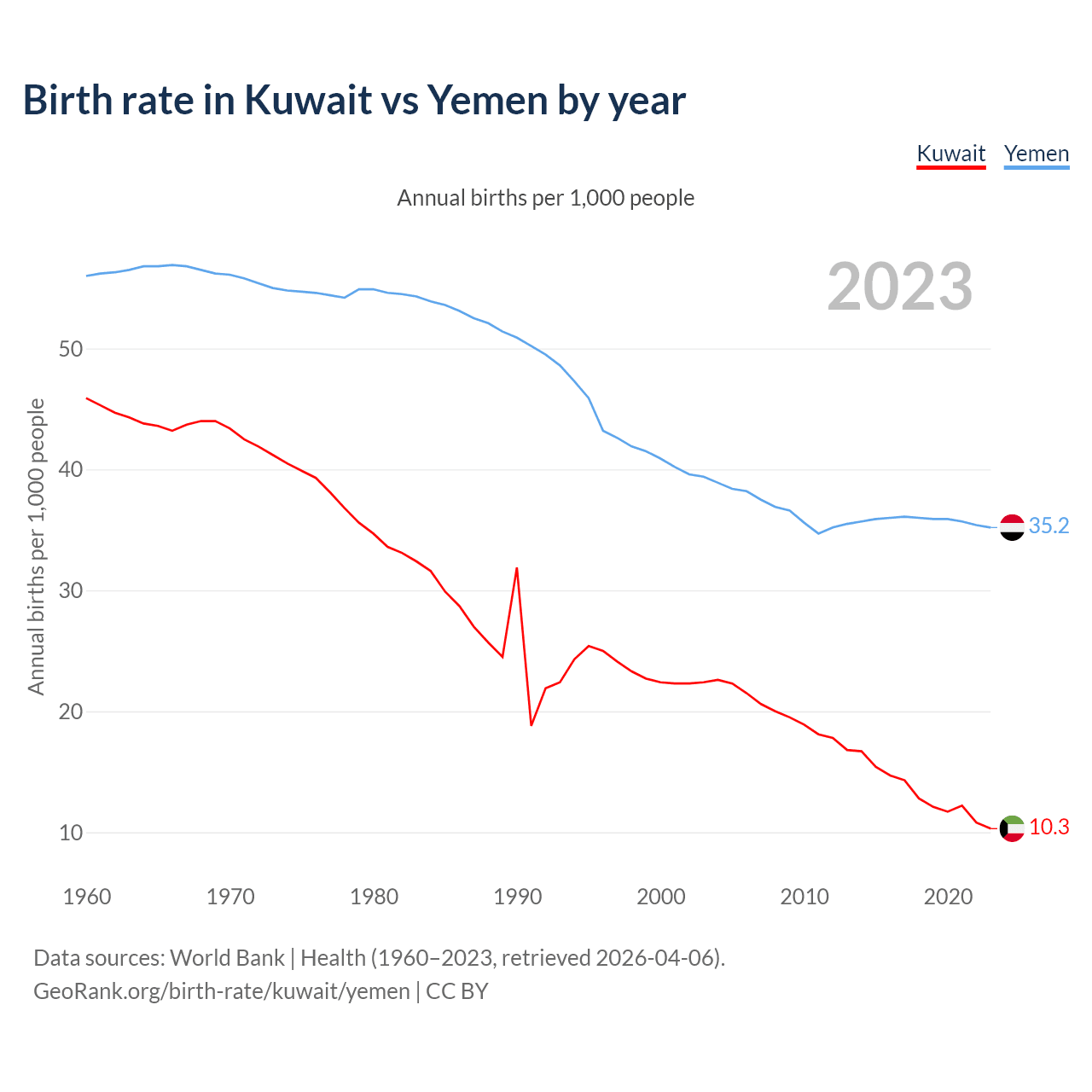 Kuwait has an annual birth rate of 10.3 births per 1,000 people, compared to 35.2 for Yemen. The average number of children a woman is expected to have during her lifetime — the fertility rate, is 1.52 in Kuwait and 4.59 in Yemen — 201.2% difference.