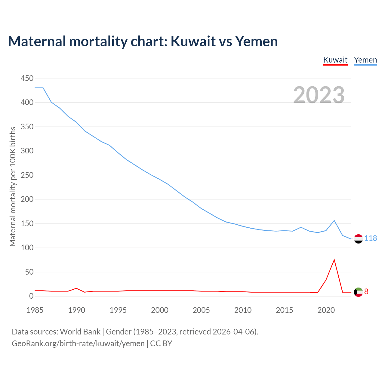 The maternal mortality rate, which is the probability of dying during childbirth or within 42 days of pregnancy termination, is 8 deaths per 100,000 live births in Kuwait, compared to 118 deaths in Yemen.
