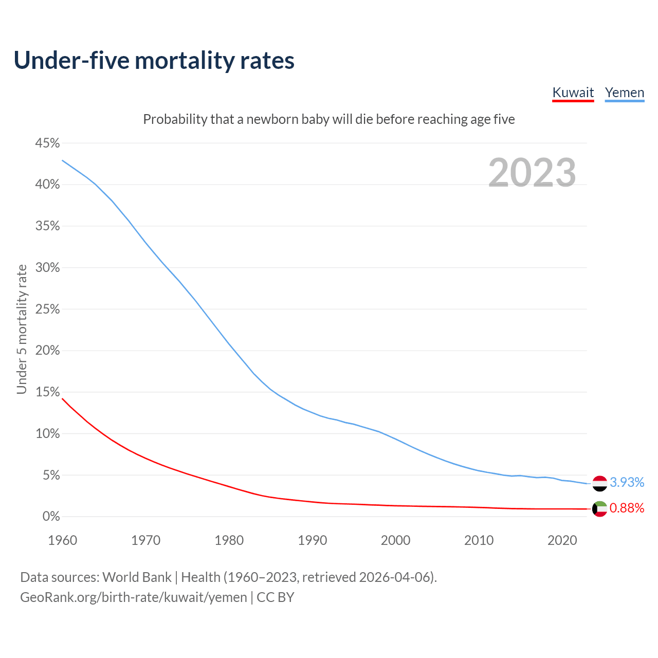 The chance that a newborn baby will die before reaching age five is 0.88% in Kuwait and 3.93% in Yemen. Above is a chart with historical data on under-five mortality rates.