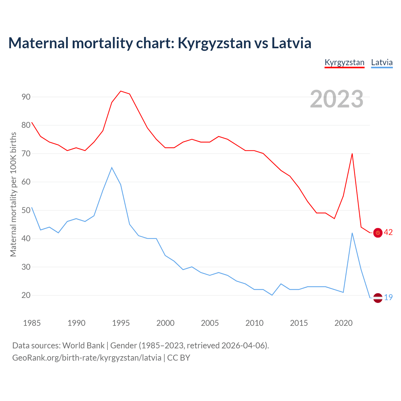 The maternal mortality rate, which is the probability of dying during childbirth or within 42 days of pregnancy termination, is 42 deaths per 100,000 live births in Kyrgyzstan, compared to 19 deaths in Latvia.