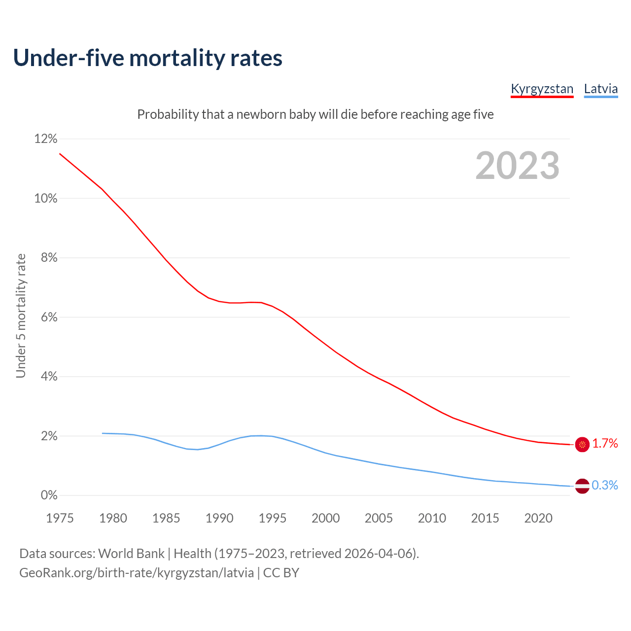 The chance that a newborn baby will die before reaching age five is 1.7% in Kyrgyzstan and 0.3% in Latvia. Above is a chart with historical data on under-five mortality rates.