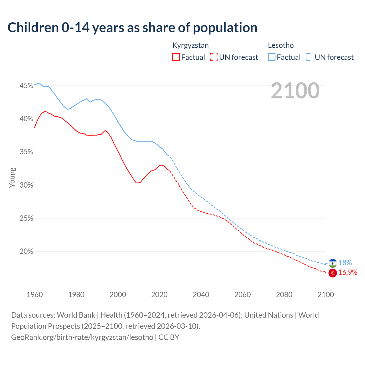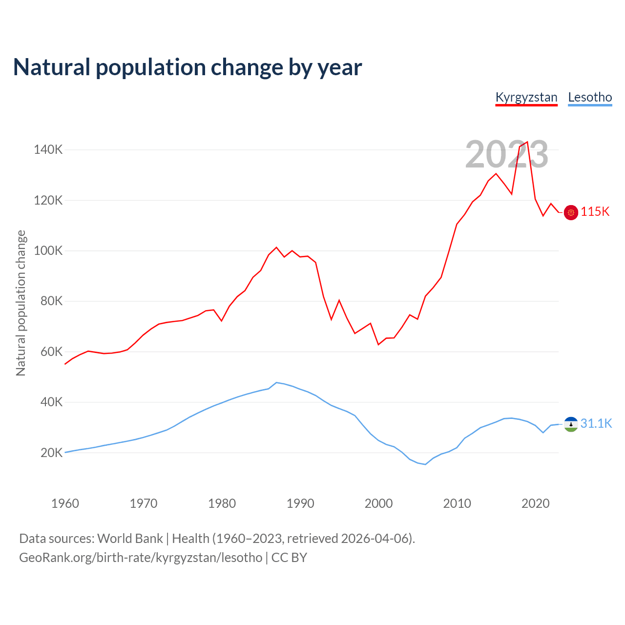 Kyrgyzstan has an annual birth rate of 20.6 births per 1,000 people, compared to 24.1 for Lesotho. The average number of children a woman is expected to have during her lifetime — the fertility rate, is 2.7 in Kyrgyzstan and 2.69 in Lesotho — 0.22% difference.