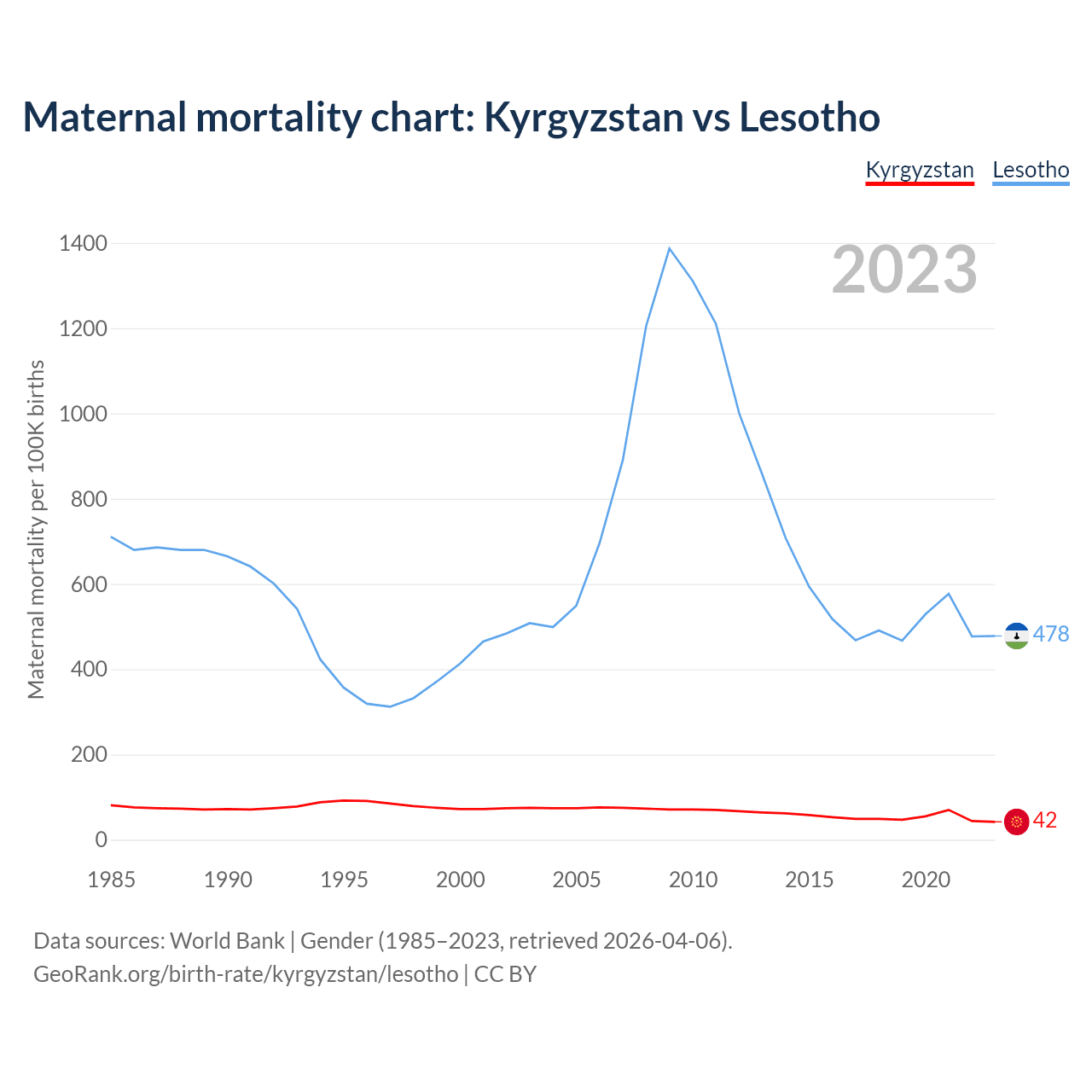 The maternal mortality rate, which is the probability of dying during childbirth or within 42 days of pregnancy termination, is 42 deaths per 100,000 live births in Kyrgyzstan, compared to 478 deaths in Lesotho.