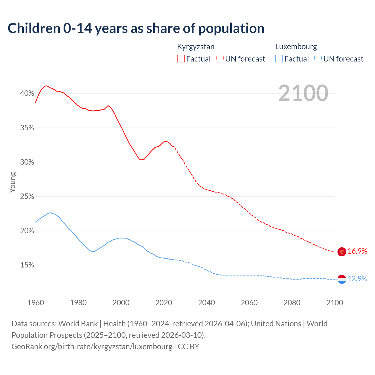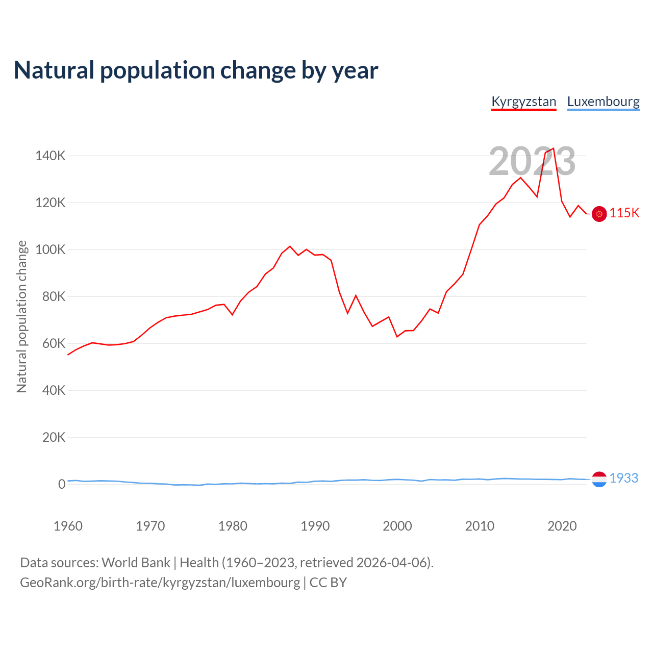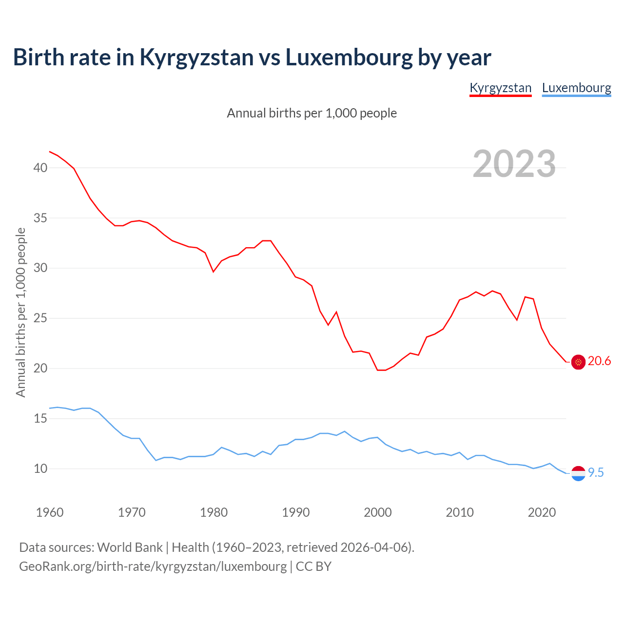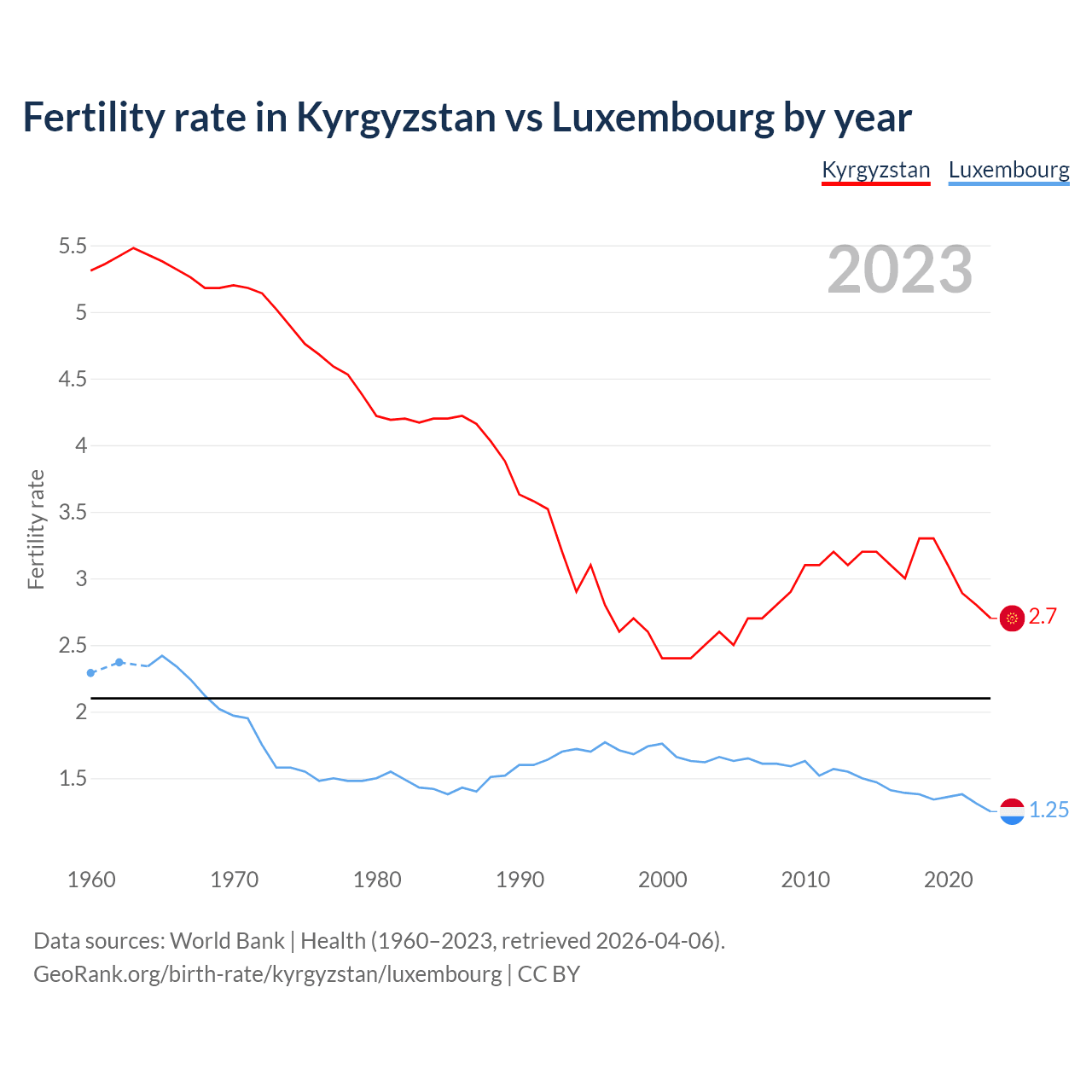 Kyrgyzstan has an annual birth rate of 20.6 births per 1,000 people, compared to 9.5 for Luxembourg. The average number of children a woman is expected to have during her lifetime — the fertility rate, is 2.7 in Kyrgyzstan and 1.25 in Luxembourg — 53.7% difference.
